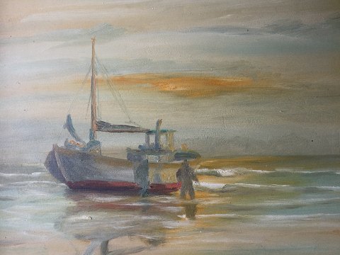 Niels Jensen (1907-2003): Fiskekutter på stranden, Blokhus 1959. Olie på lærred. Sign.: NJ 59. 31x33 (37x40) 19324