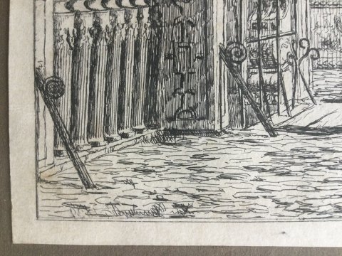 Thorald Læssøe (1816-78): Indkørselsporten på Vallø Slot 1839. Radering på papir. Sign.: Thorald Læssøe 1839 (Spejlvendt i trykket) 18x21 (25x28)