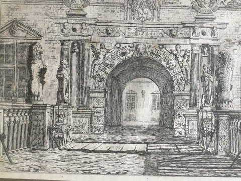 Thorald Læssøe (1816-78): Indkørselsporten på Vallø Slot 1839. Radering på papir. Sign.: Thorald Læssøe 1839 (Spejlvendt i trykket) 18x21 (25x28)
