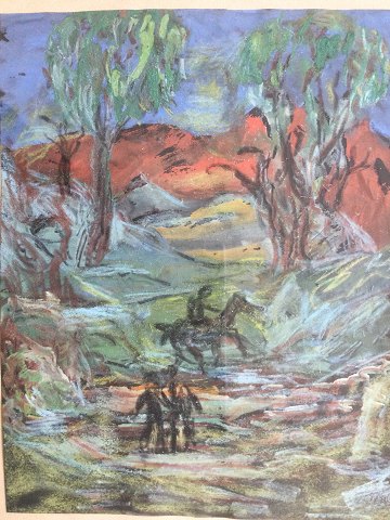 Jens Nielsen (1891-1978): Personer i landskab. Sign.: Jens Gouache på papir. Lille skjold på passepartout forneden - Maleriet perfekt. 25x20 (47x34) 22424