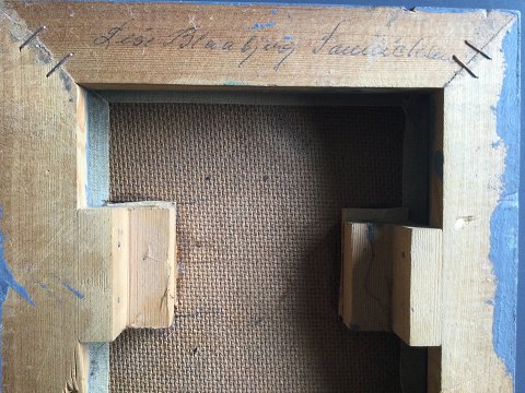 Lise Blaabjerg (1939-2020): Komposition - Vandkanten. Olie på lærred monteret på plade. Sign.: Lise Blaabjerg Sonnichsen (bagpå) 15x14 - (18½ x 17½) 22424