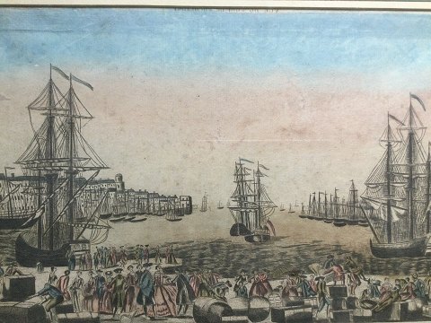 Jacques Chereau (1688-1776): "Embarquement des Francais pour...." Håndkoloreret Kobberstik på papir. Indrammet i smuk "sølv" ramme hos Hugo Kerr i Hamburg. 27x43 (37x52) 23824