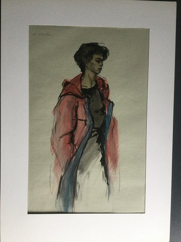 E. Lüscher (20 årh): Stående kvinde i overfrakke. Akvarel/pastel på papir. Sign.: E. Lüscher. Uden ramme men med passepartout. Mål 47x30 - Med passepartout 59x42 26624