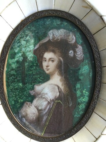 Ubekendt miniature maler (19 årh): Portræt af ung dame med fjerprydet hat i havelandskab. Gouache på ben. Sign.: usigneret Indrammet i lettere defekt og bulet benramme. Mål: 8½ x 6½ (14x12)