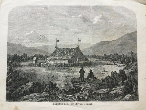 Carl Emil Baagøe (1829-1902): Kirken i Reykjavik, Island. Xylografi på papir. Sign.: carl Baagøe (i trykket) Betegnet "Reykjahlid Kirke ved Mývatn i Island". Plettet Uden ramme 20½ x 27 5522