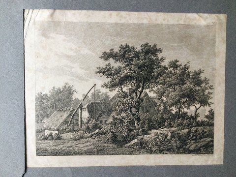 Søren Henrik Petersen (1788-1860): Bondegård 1831. Kobberstik på papir monteret på pap med passepartout. Sign.: S.H. Petersen sec 1831 Plettet Uden ramme. Arket 21x26 - med passepartout 25x34 41821