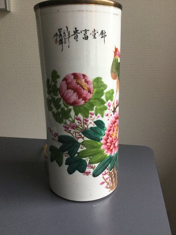 Polykromt dekoreret med fugl, blomster og skrifts tegn.