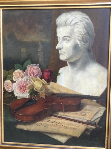 Alice Lynge (19/20 årh): Opstilling på bord med violin, partitur, rosenbuket og buste. Olie på lærred. Sign.: Alice Linge 54x42 (65x53) 24325