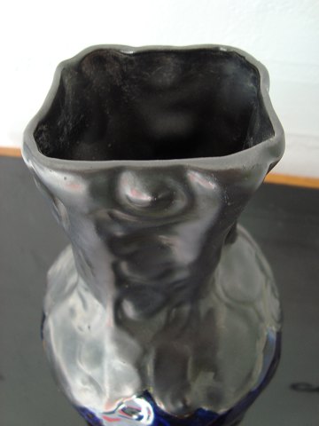 Jugend porcelænsvase. Royal Bleu glasur og tin lustre glasur i toppen. Kugleform i bund og kvadr. top. År ca 1910 Højde - 19 cm.