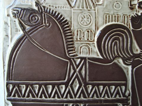 Michael Andersen, Bornholm: Relief med kvinde og mand i hestevogn gennem by. Stemplet for Michael Andersen samt nr. 5896. 23x34