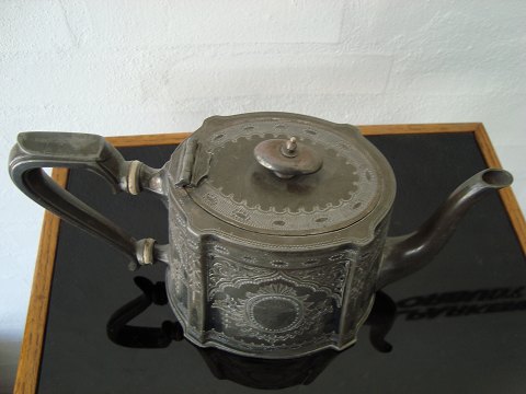 Tin Tekande med ligeknækket korpus. Dekoreret med rococomotiver og kartoucher. England år ca. 1880. Stemplet: 2027 samt diverse stempler. 15x26x11