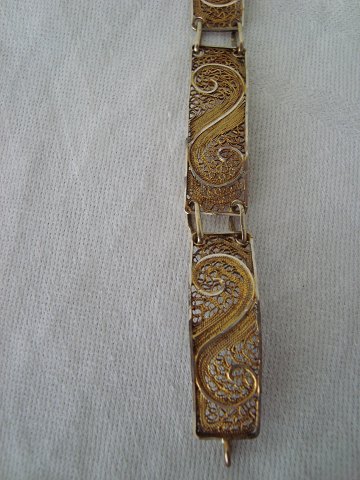 Armlænke af forgyldt sølv. 5 filigran led med ringe i mellem. Stemplet: Mange utydelige stempler. Længe armlænke - 19 cm. Ledstørrelse - 1 cm x 5 cm