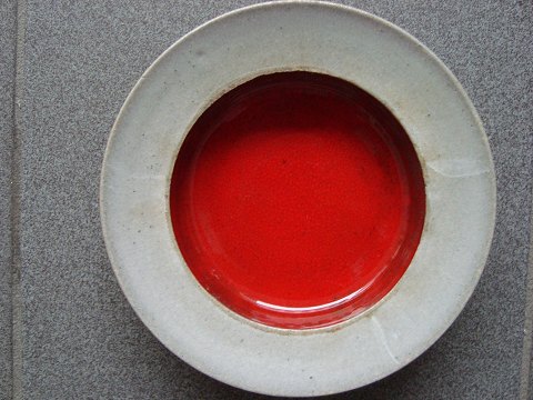 2 bordfade med ecru fane og henholdsvis rød og turkis bundglasur.