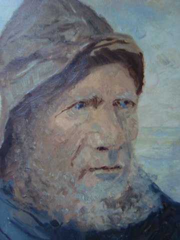 Kristian (Kræn) Bjergen (20 årh): Portræt af fisker med sydvest fra Skagen. Olie på lærred - nyrenset. Sign.: K. Bjergen. 50x42 (60x52)