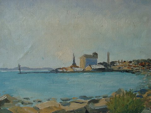 Ubekendt kunstner (20 årh): "Kystparti med by i baggrunden" Smukke lyse farver. Olie på lærred. Sign.: H. Thyrring T....... 27x34 (36x44)