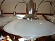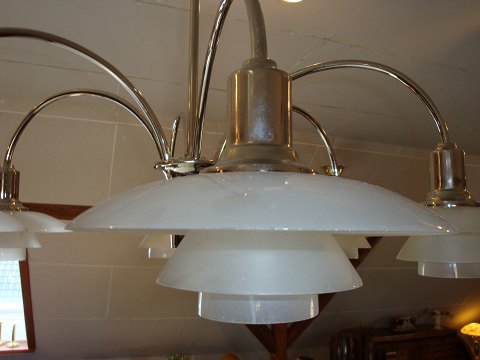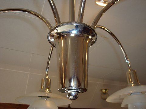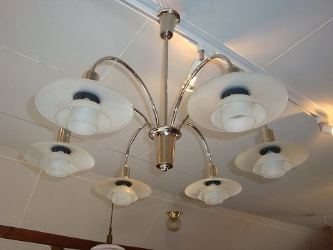 PH Bombardment Chandelier in chrome metal with 6 arms from the years around 1940 with original shades in clear glass 5000 m2 showroom