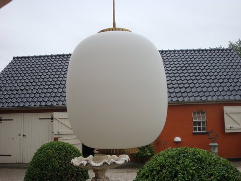 Kinapendel af Bent Karlby. Opalglas og med messing i bund & top. Måler 39 cm i højden og Ø98.5cm
