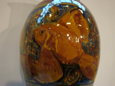 SolgtGulvvase af Herman Kähler med fiskemotiver i flotte brunlige nuancer.