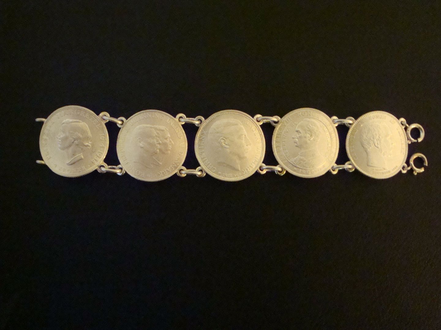 SolgtSølv armbånd af gl. danske 2 kroner.