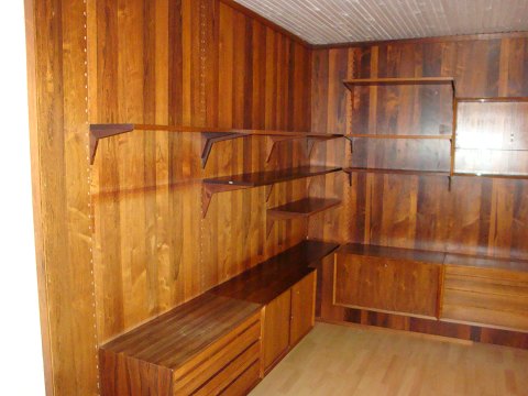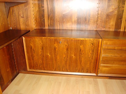 SoldComplete 2 * 3,5 m shelf system by Poul Cadovius in rosewood and of great quality. The shelf system contains 8 wallboards, 6 lower cabinets of which 2 are with drawers and the rest with doors, including 15 shelves.