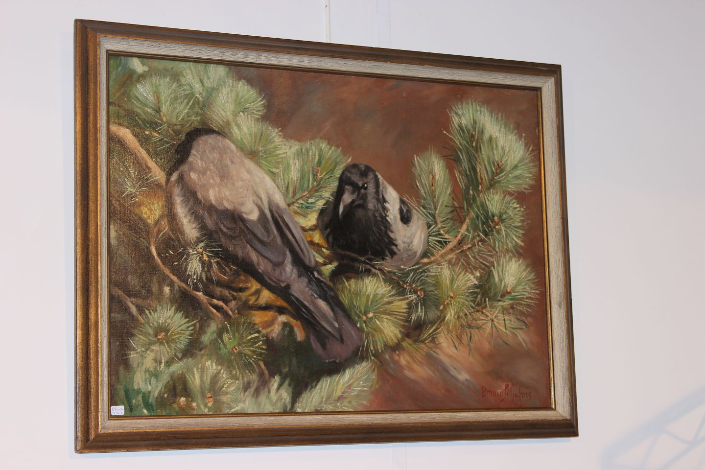 SolgtOliemaleri kopi af Bruno Liljefors fra 1891. Motiv af grå krager. Maleriet måler med ramme 77,5cm x 58cm.