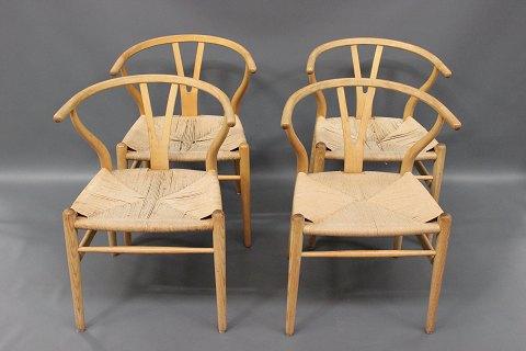 4 stk Hans Wegner stole model Y-stolen ch 24 med håndflettet sæde i lakeret ask .Højde 75 cm , Sædehøjde 44 cm . Stolen blev designet i 1949.