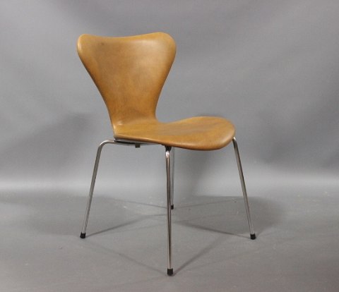 6 pcs Arne Jacobsen Model 3107. Re-upholstered with cognac colored patinated leather in good condition