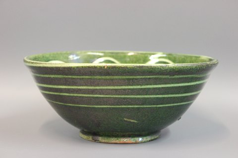 SoldMedium size green ceramic bowl with white and green glaze pattern.