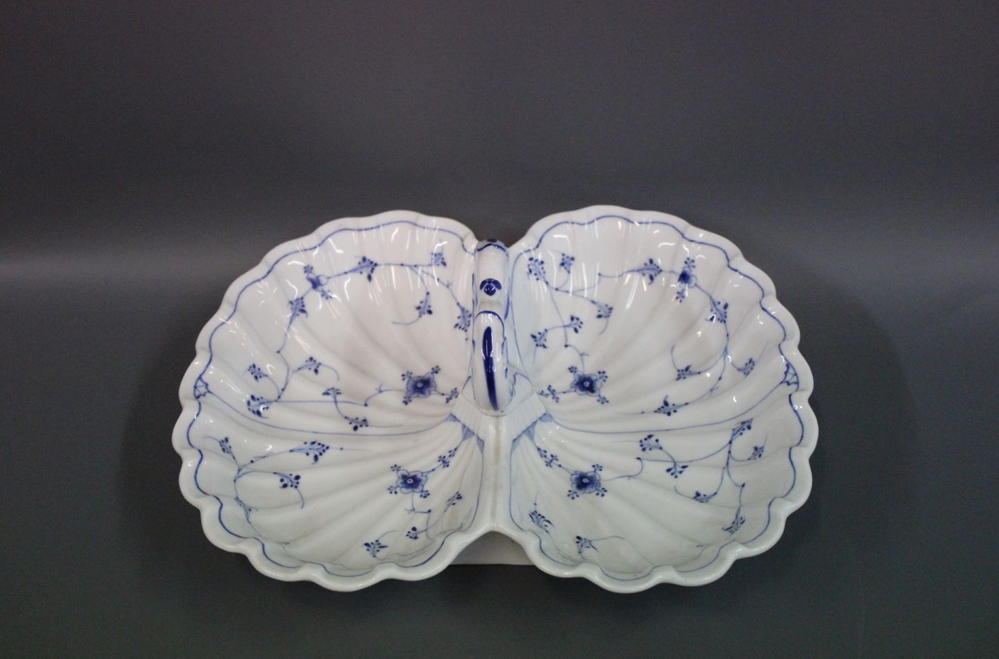 SoldRoyal Copenhagen blue fluted two piece compartment dish with handle. The Dish was made between 1870 and 1890.