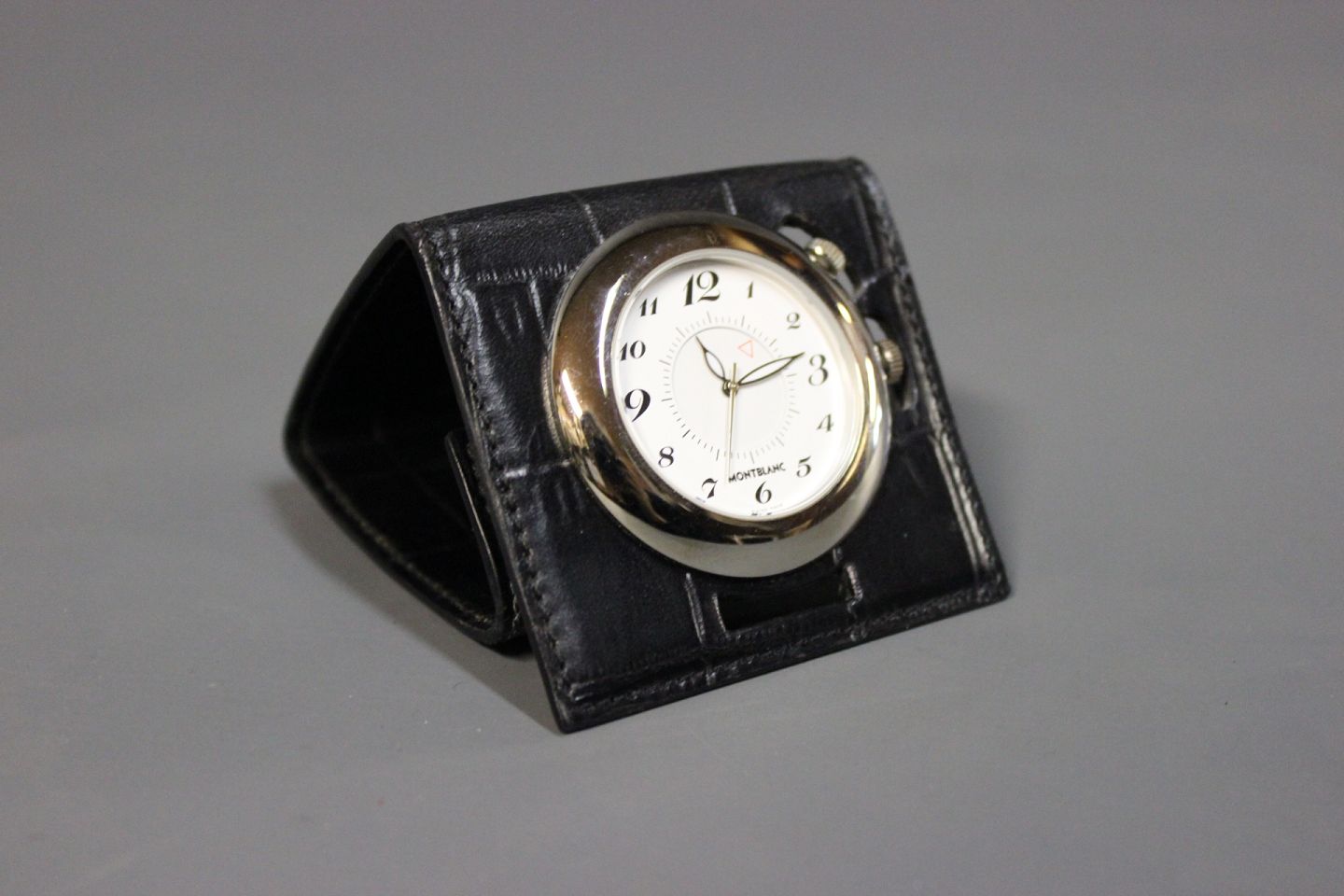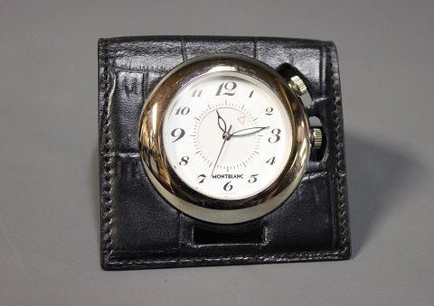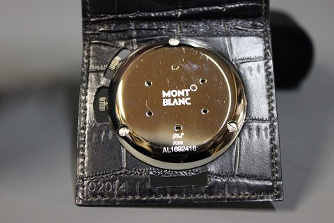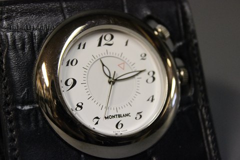 SolgtMont Blanc rejseur af stål med alarmfunktion, quartz værk og schweizisk. Uret har nr.: 7056, AL1692416 og er i et foldeligt læderetui med Mont Blancs logo.