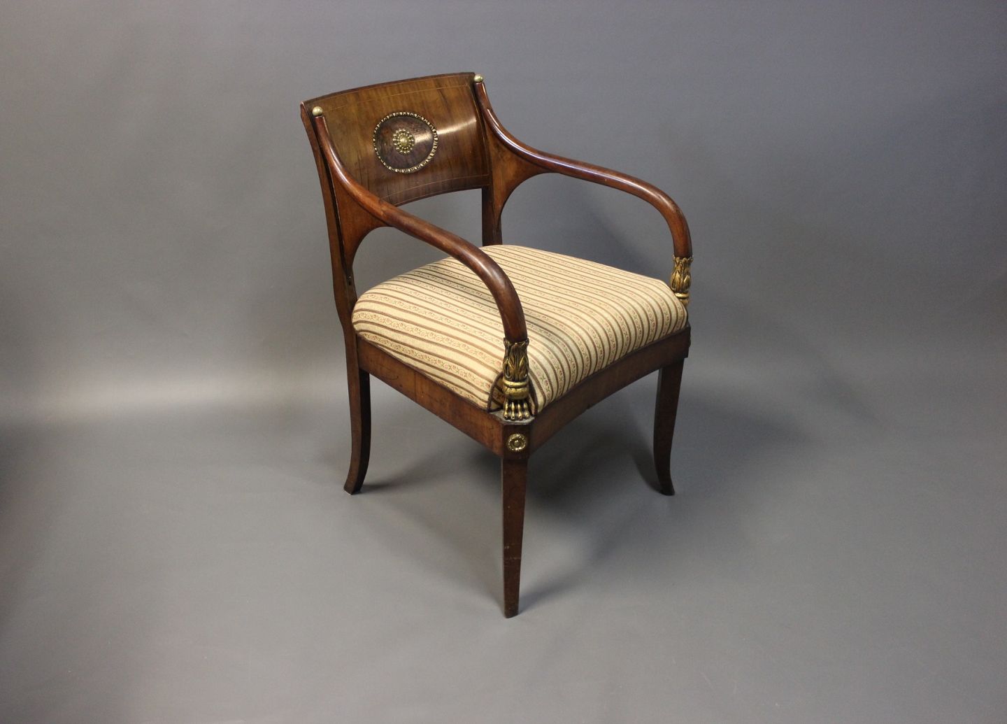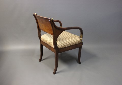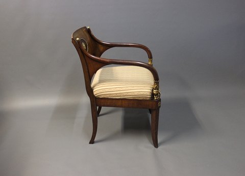 SolgtArmstol i poleret mahogni, indlagt med frugttræ og udsmykket med messing og blad guld. Stolen blev lavet i Tyskland i 1830 og er polstret i lyst stof.