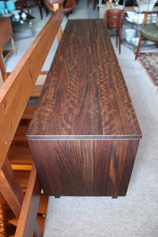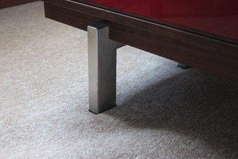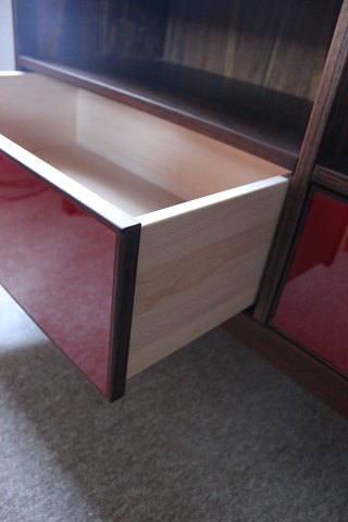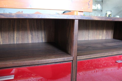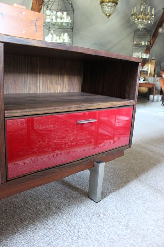 SoldLong sideboard in walnut with drawers with red formica and metal legs.