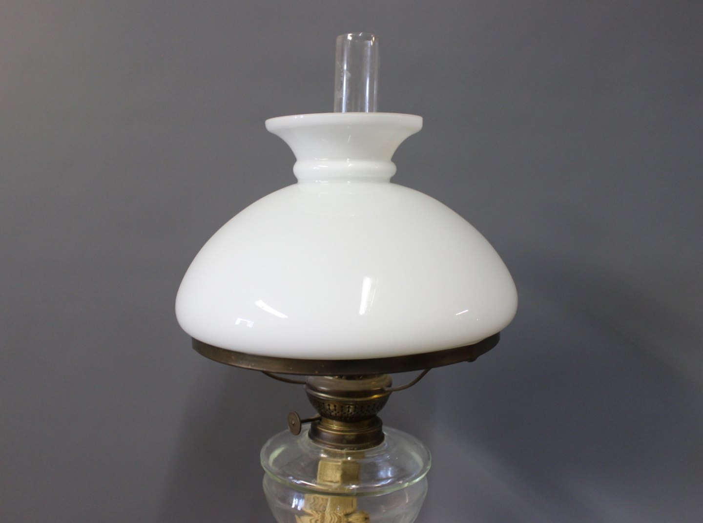 Kerosene tablelamp in brass with figurine and a White glass dome from around the year 1880.