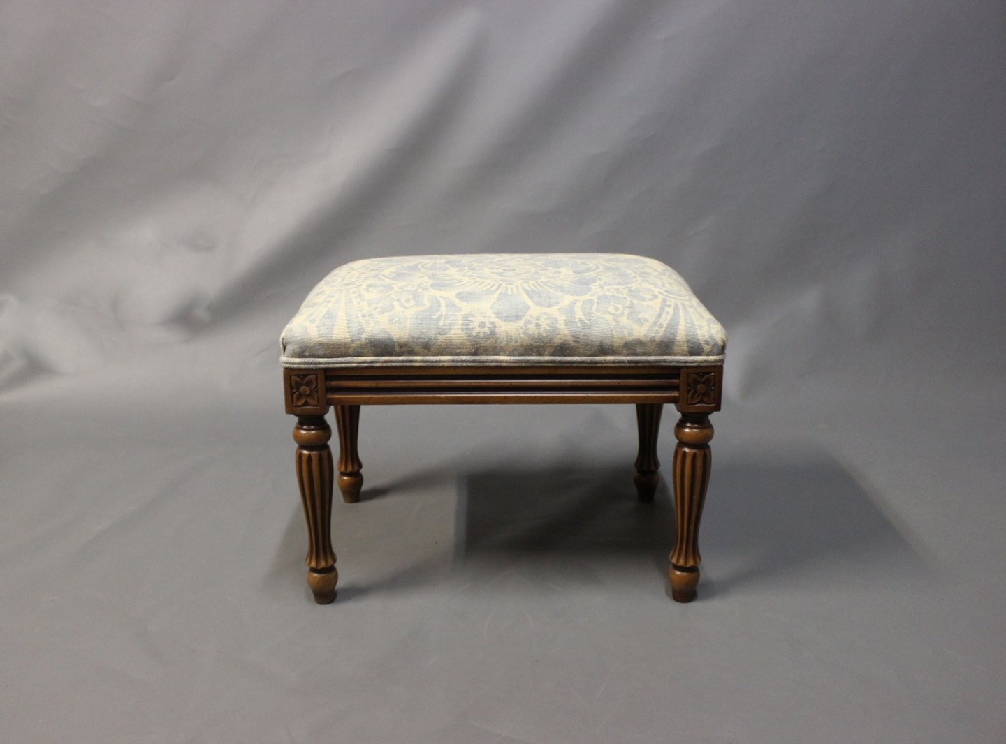 SoldSmall footstool in mahogany and light fabric from the 1950s, remaining in a very good vintage condition.