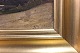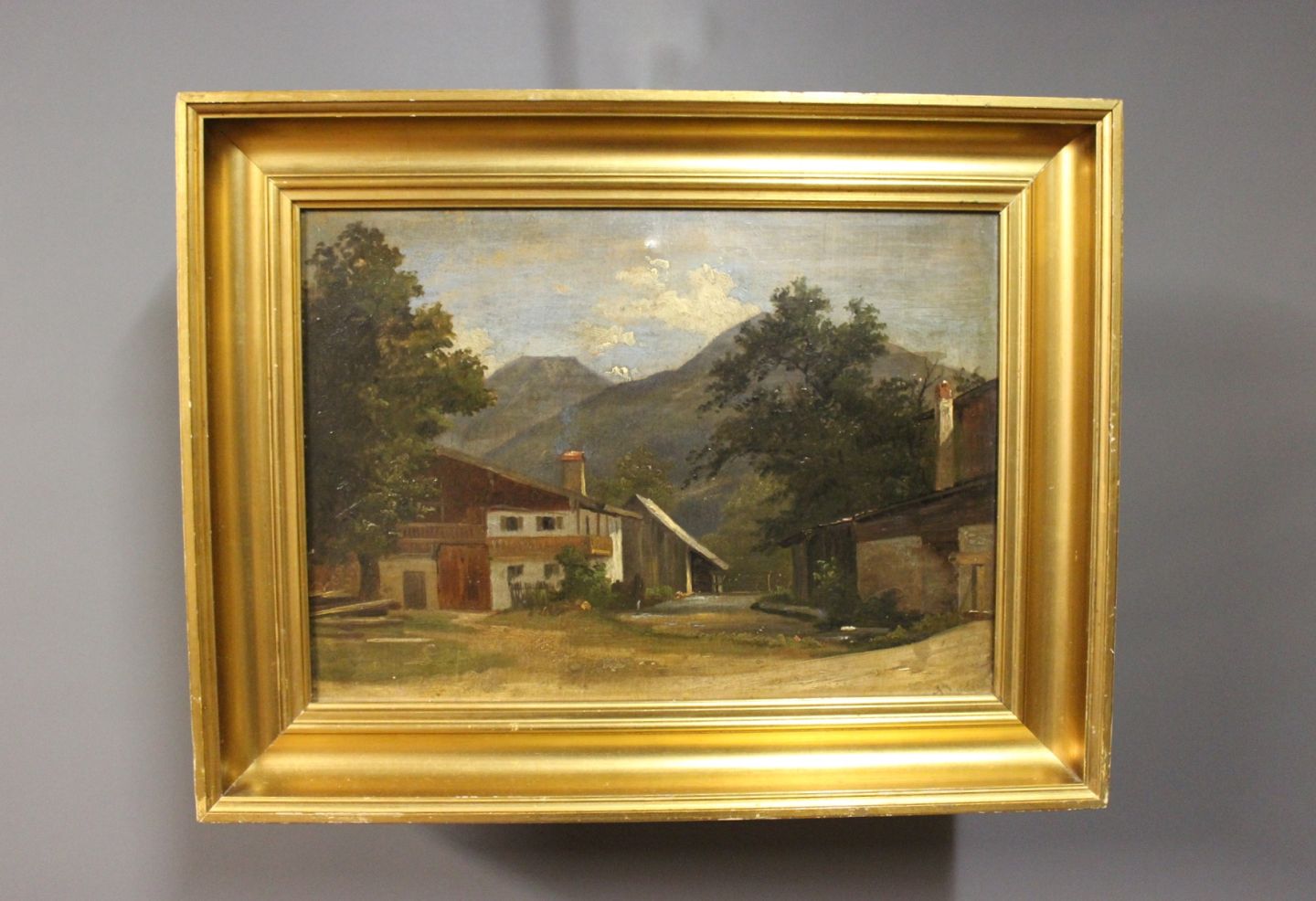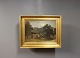 Oliemaleri af hus i bjergene signeret A. Paul med træramme dekoreret med guldblad.