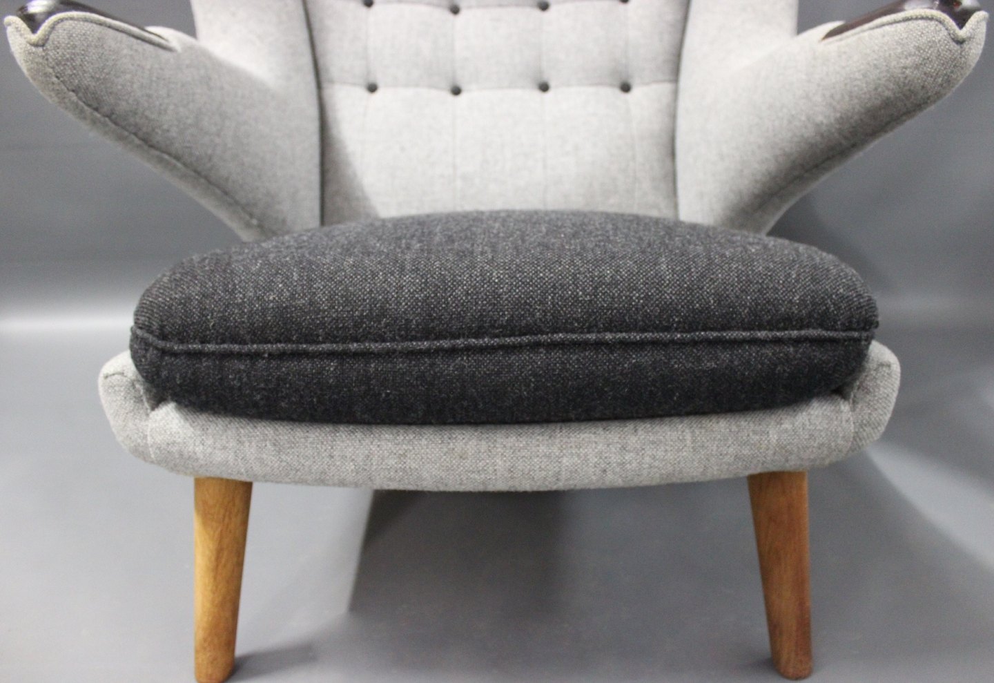 SoldPapa Bear chair, model AP 19, and stool model PP120, designed by Hans J. Wegner in 1951/54 and manufactured by A.P. Møbler. The chair is upholstery in light and dark grey Hallingdal wool, legs and paws of teak.