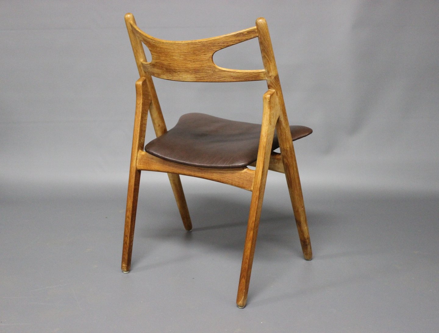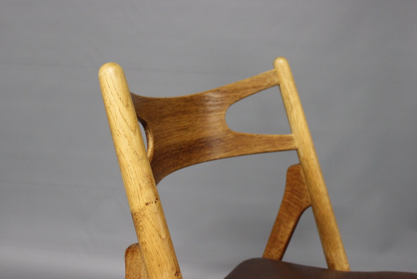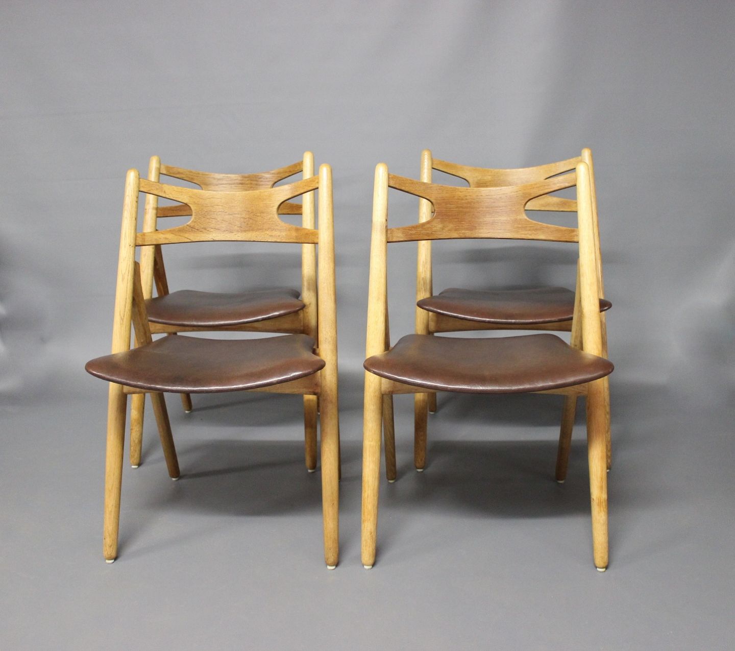 SolgtEt sæt af fire Savbuk stole, model CH29, designet af Hans J. Wegner i 1952 og fremstillet af Carl Hansen & Søn i 1960erne. Stolene er af eg og med sæder af brunt patineret læder.