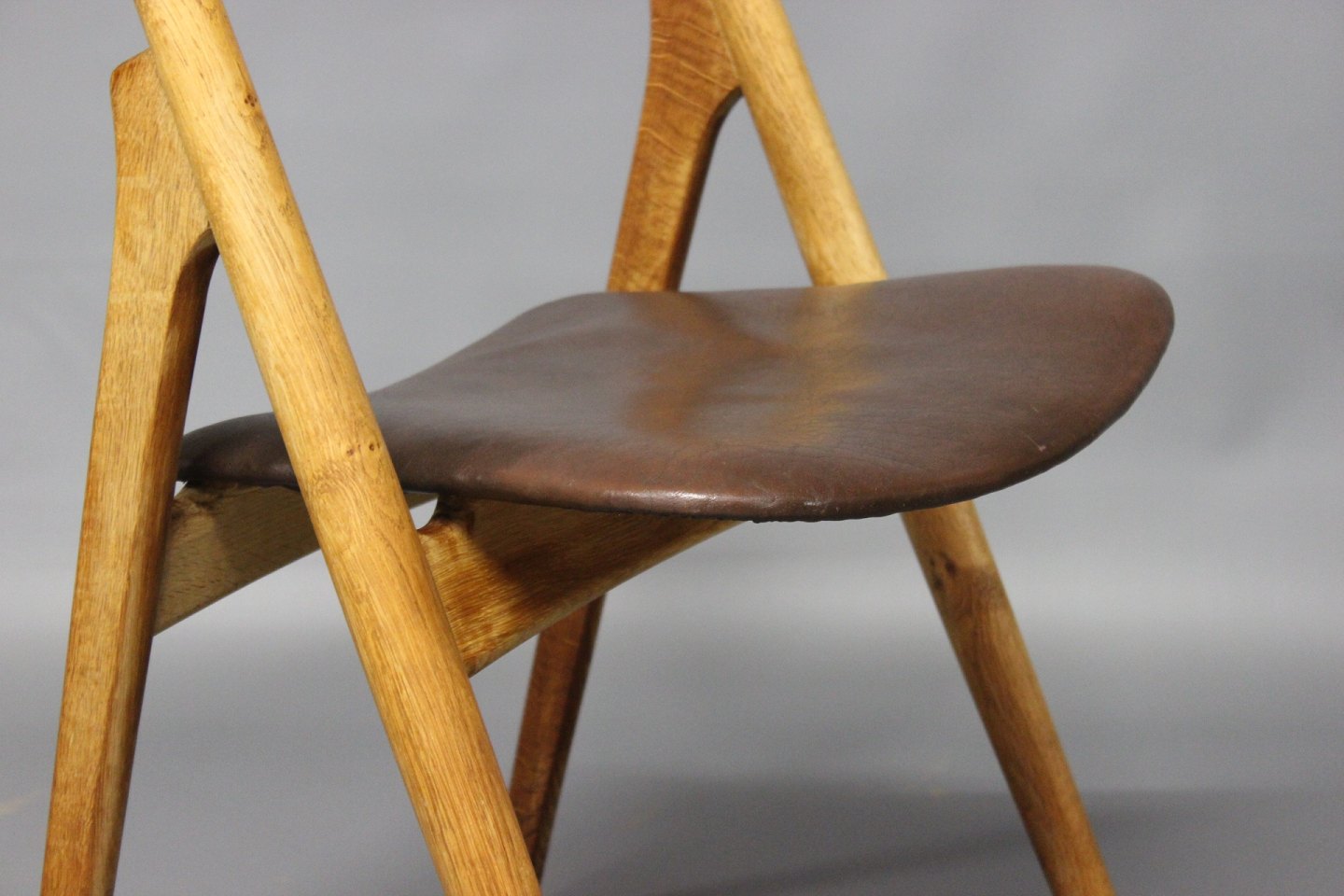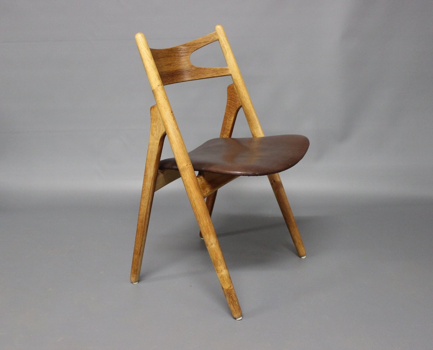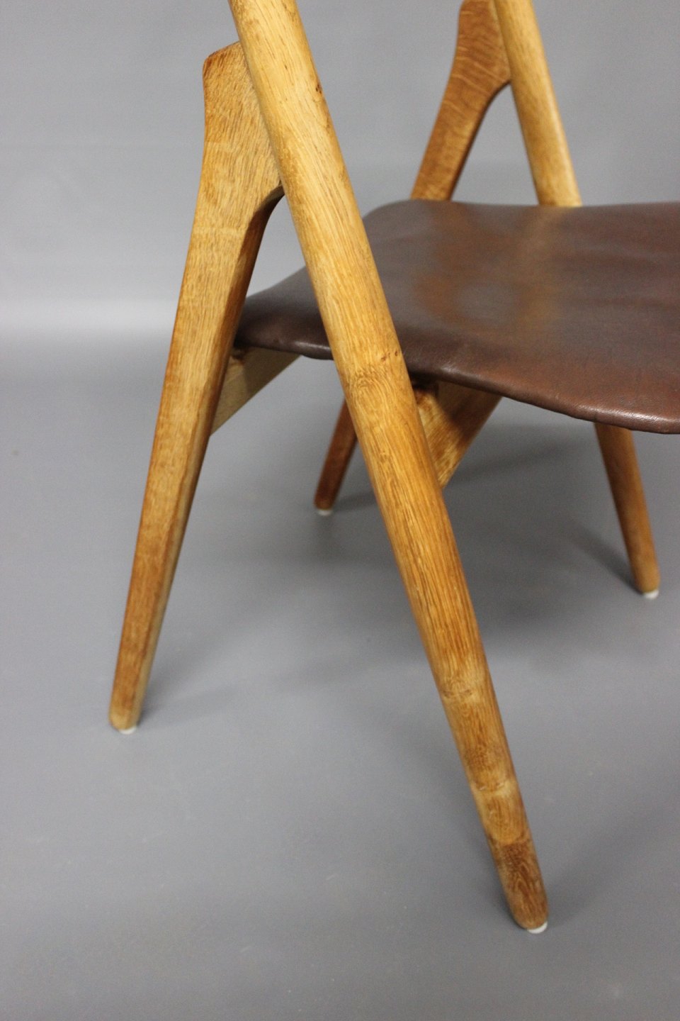 SolgtEt sæt af fire Savbuk stole, model CH29, designet af Hans J. Wegner i 1952 og fremstillet af Carl Hansen & Søn i 1960erne. Stolene er af eg og med sæder af brunt patineret læder.
