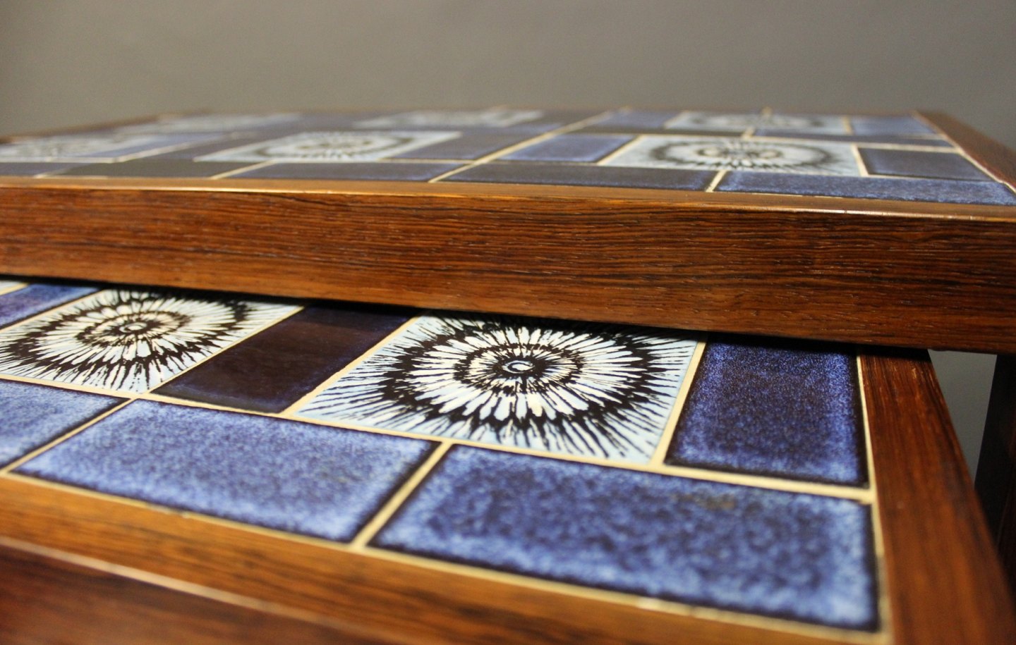 SoldA set of nesting tables in rosewood with tiles in blue colors, Danish Design from the 1960s.