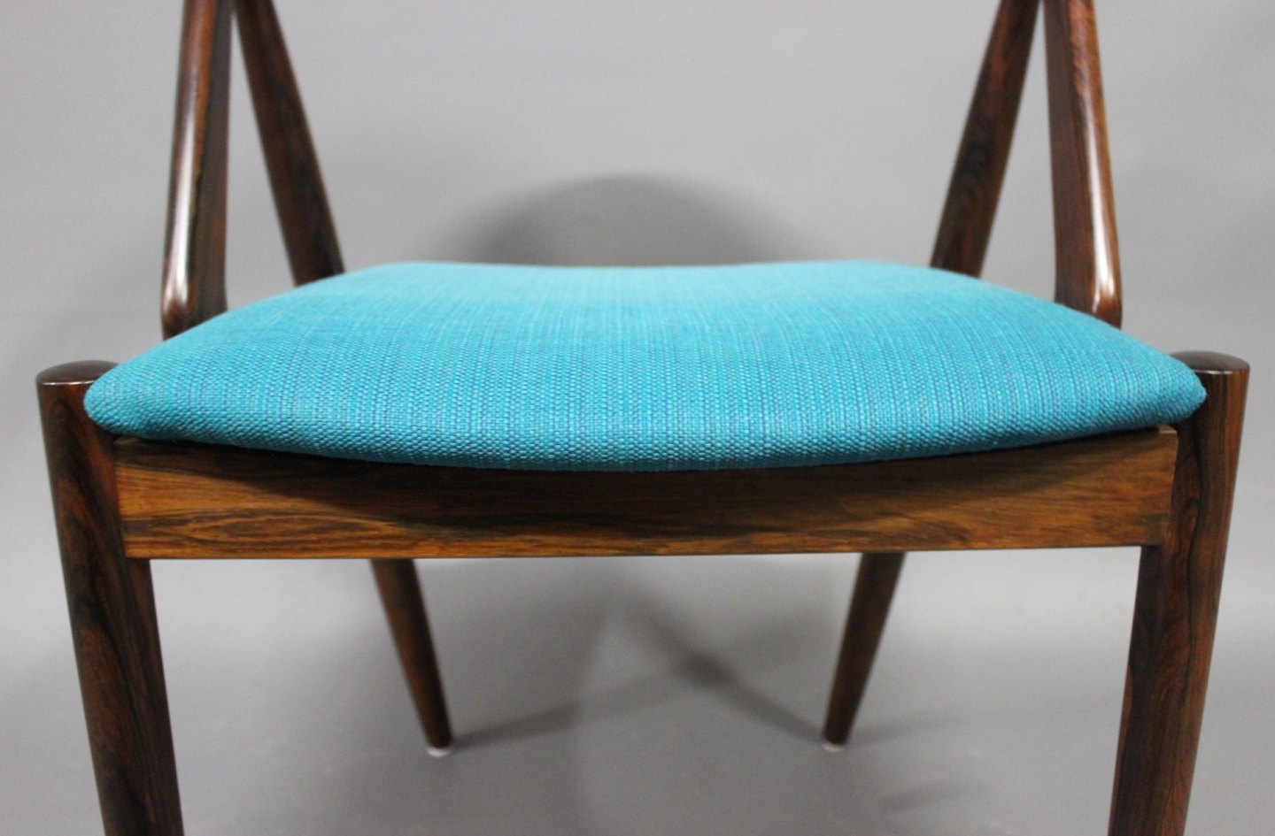 SoldA set of six dining room chairs, model 31, designed by Kai Kristiansen in 1956 and manufactured by Schou Andersen in the 1960s. The chairs are in rosewood and upholstered in blue fabric.