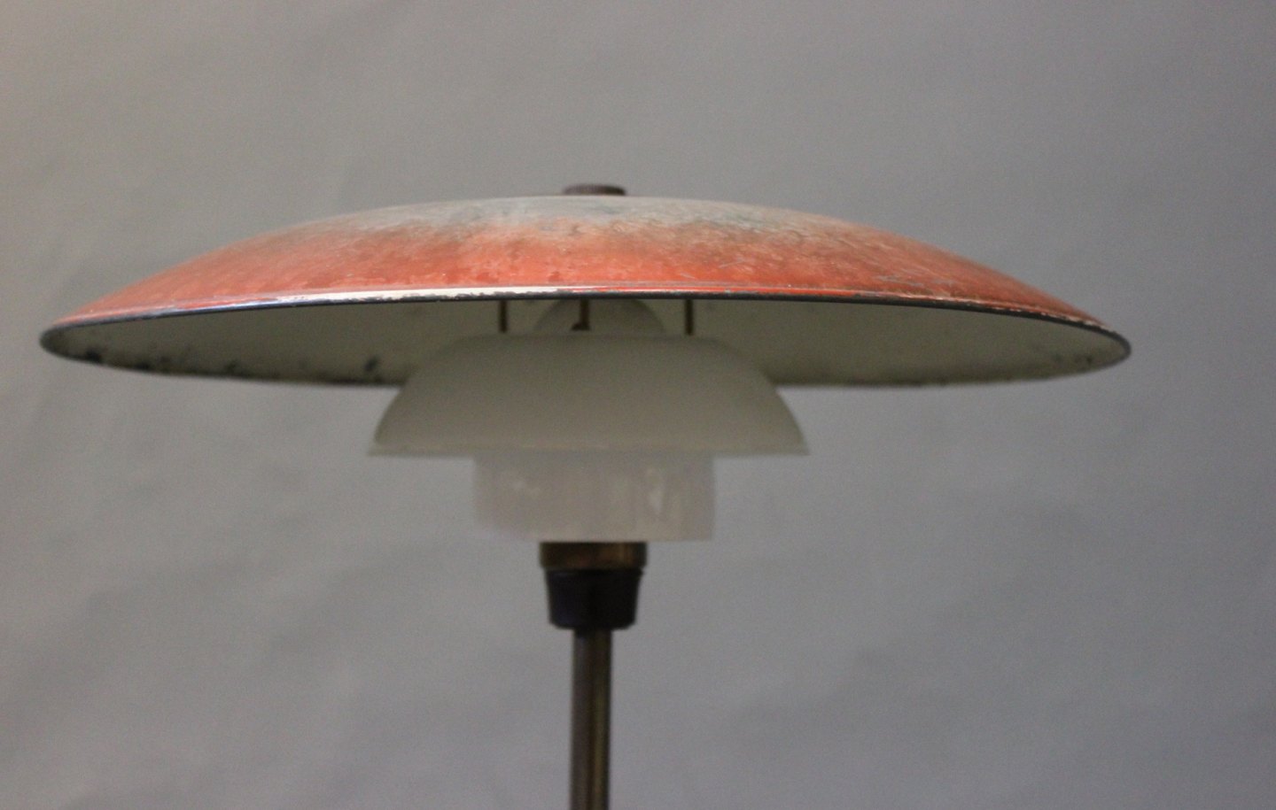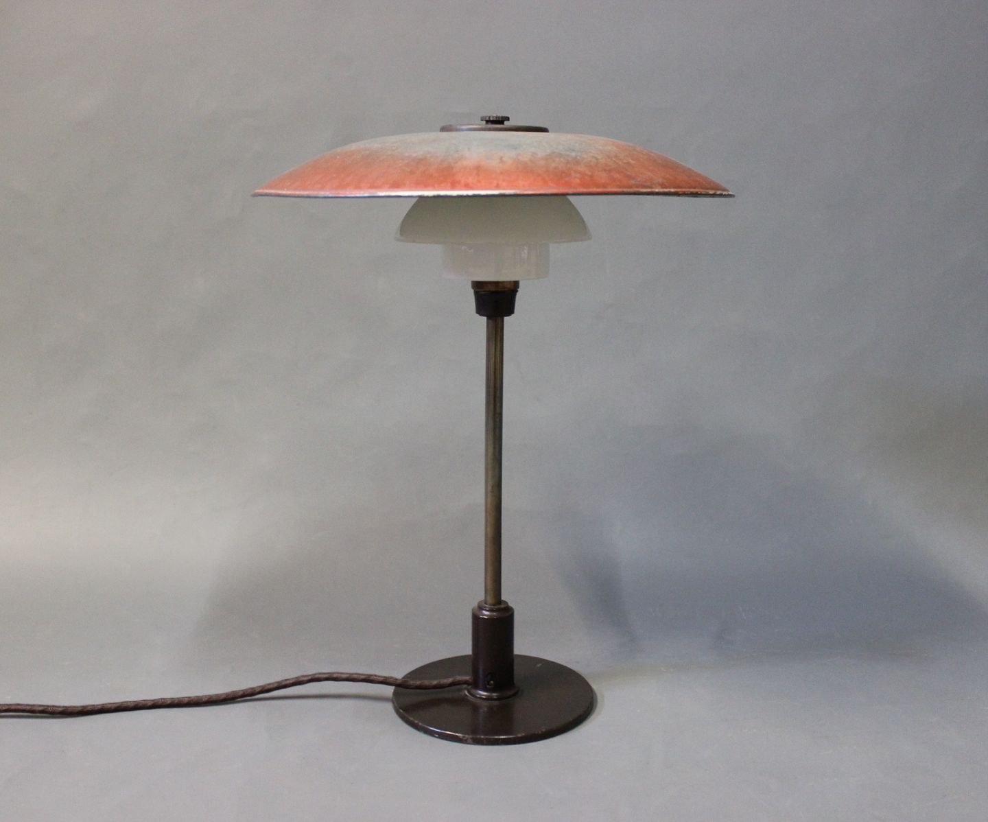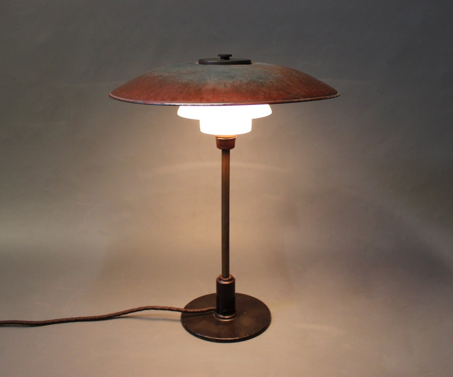 SolgtPH 3,5/2,5 bordlampe fra 1930erne designet af Poul Henningsen og fremstillet hos Louis Poulsen. Lampen er af opal glas og bruneret messing.