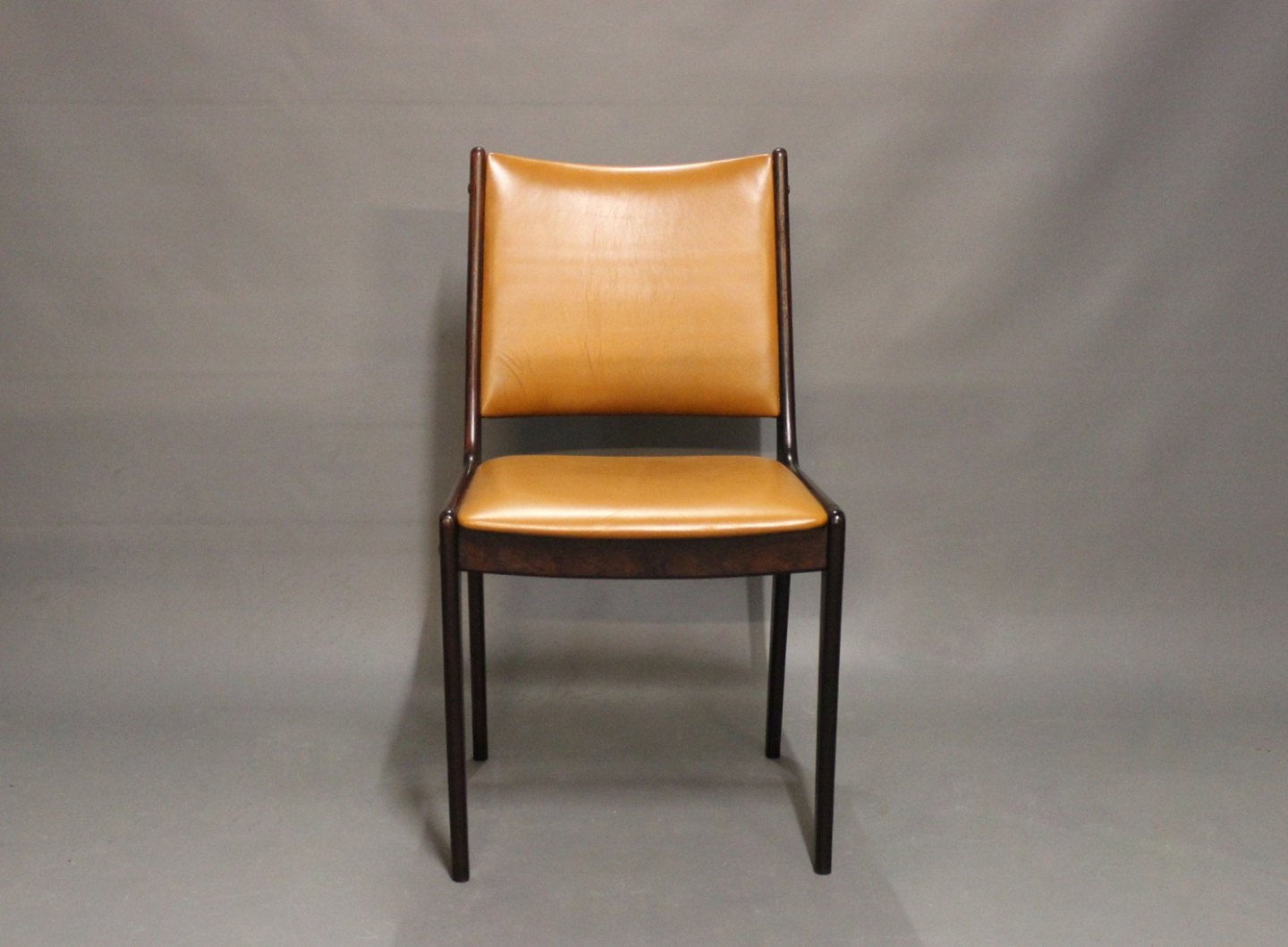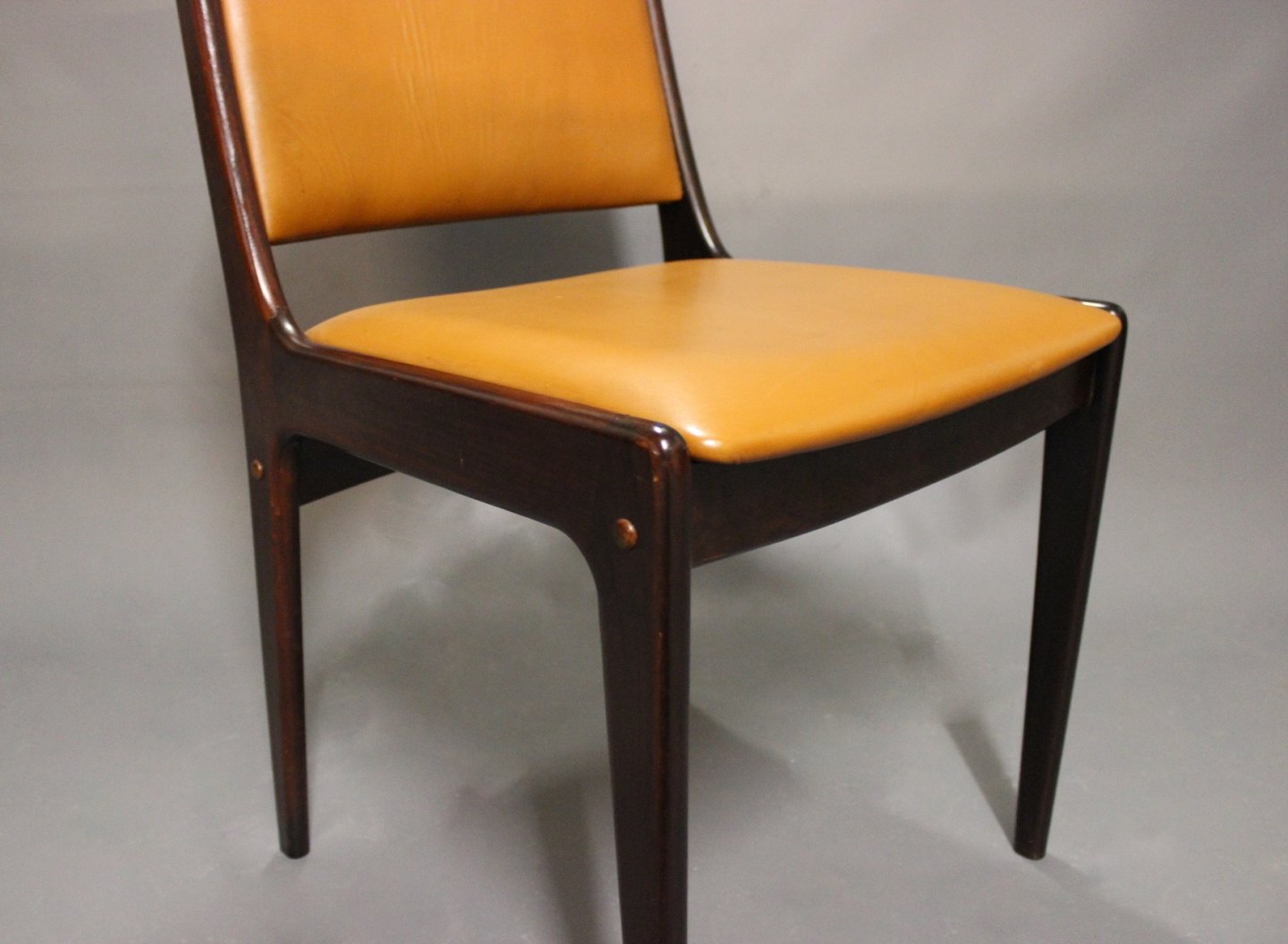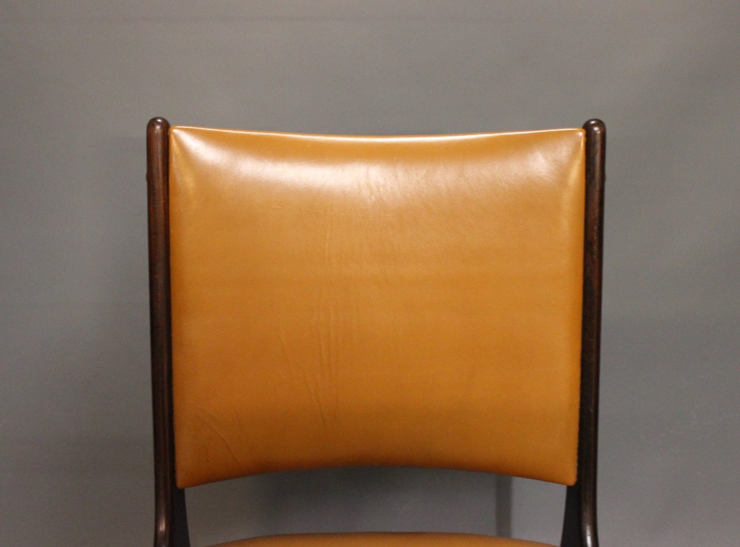 SoldA set of 4 dining room chairs in polished mahogany and cognac colored leather. The chairs are of danish design from the 1960s.