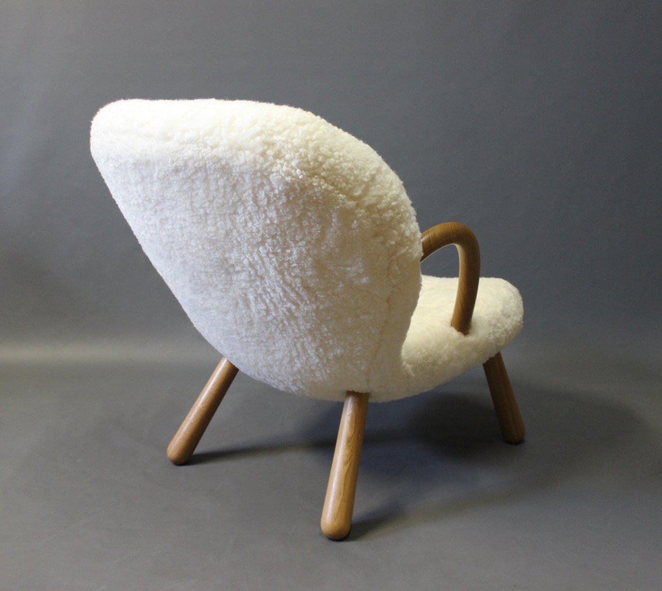 Sold"The Clam Chair" originally designed by Phillip Arctander in 1944 and manufactured by Paustian in 2016. The chair is upholstered in sheep skin and with amrs and legs og oak.