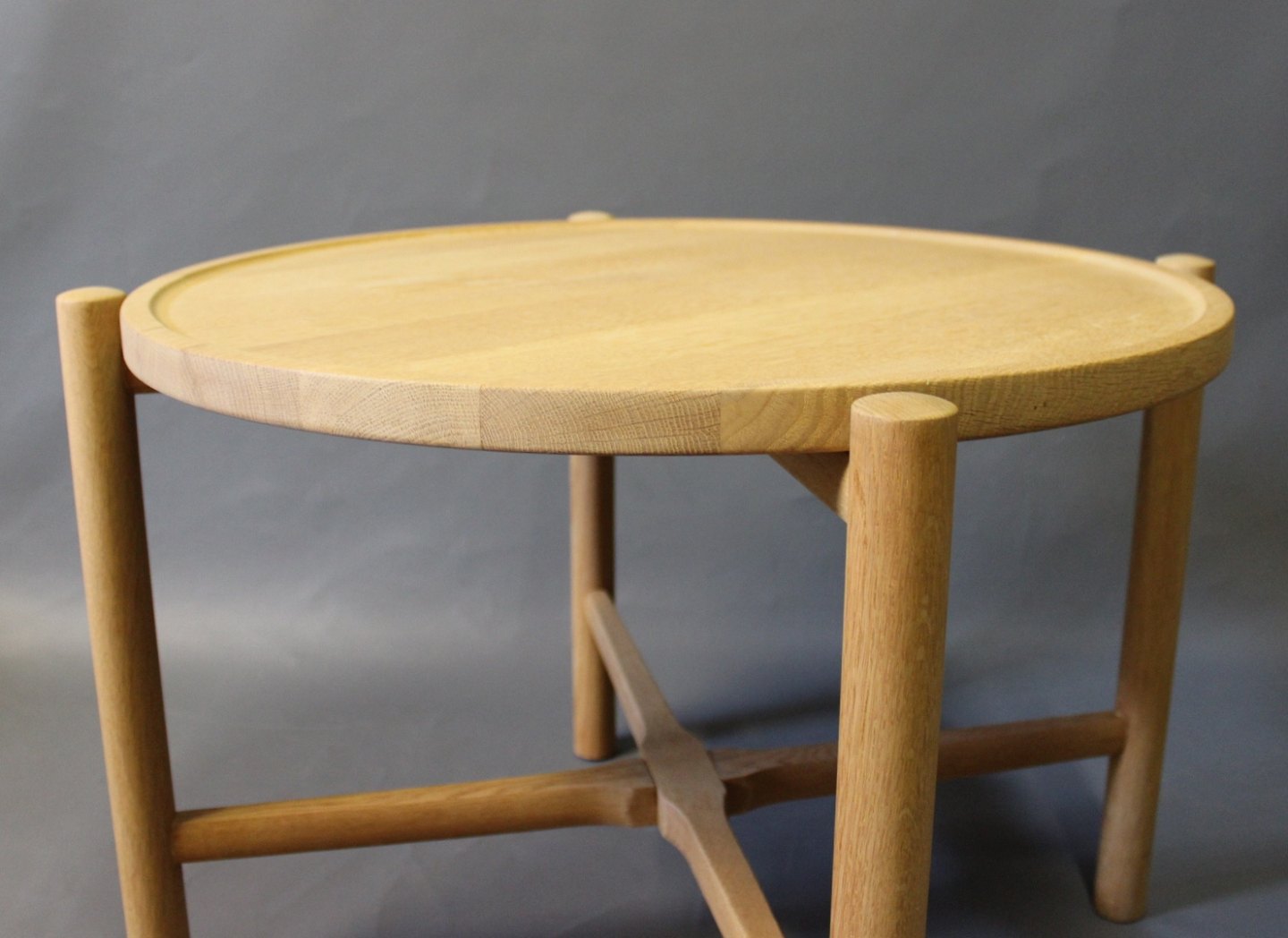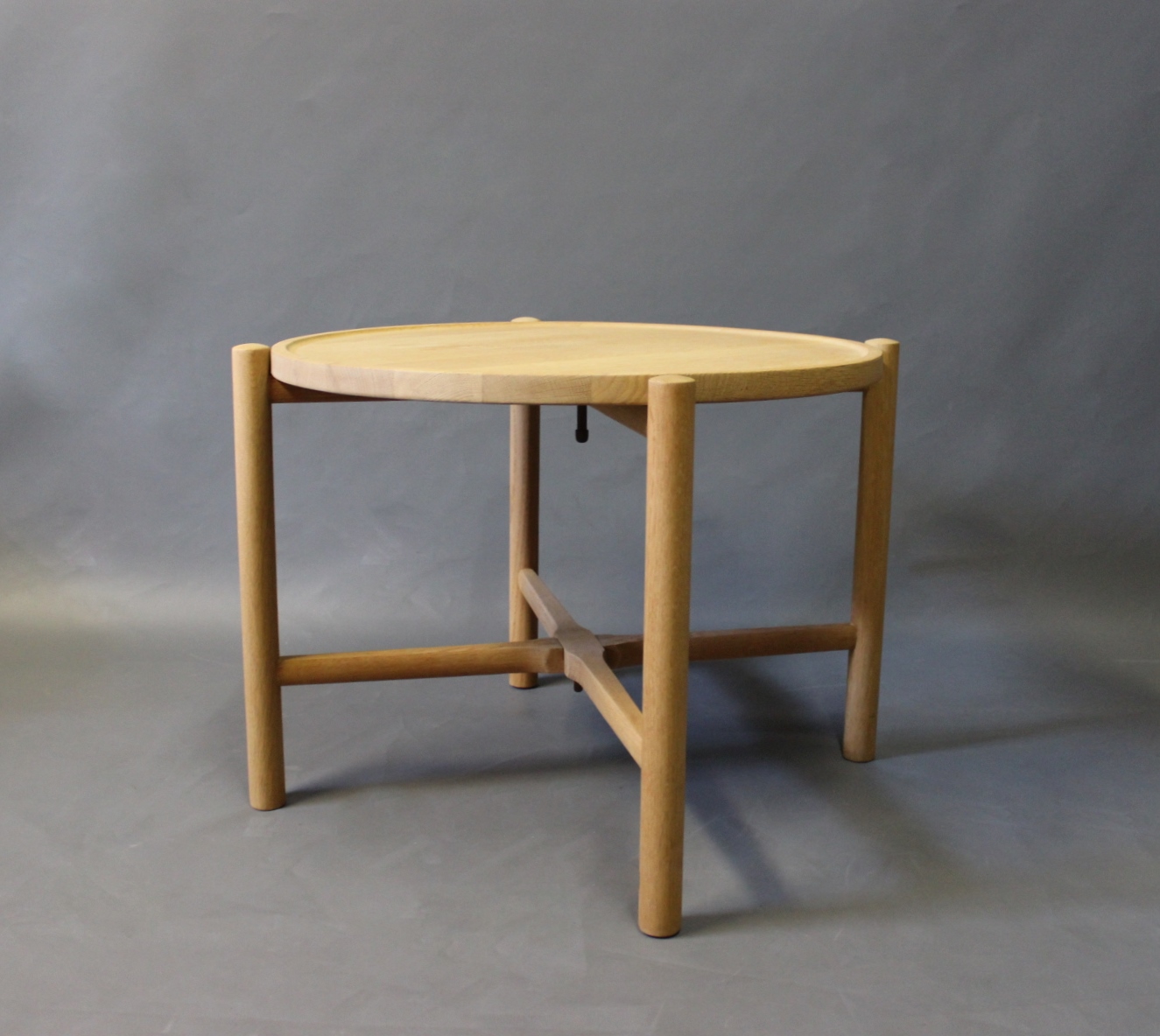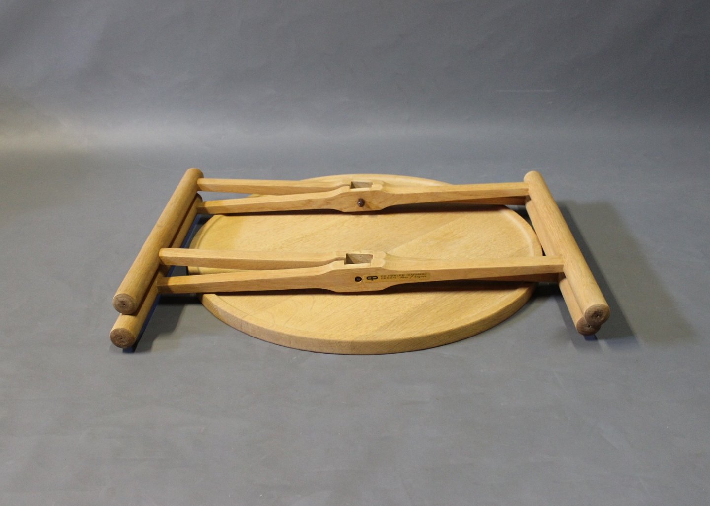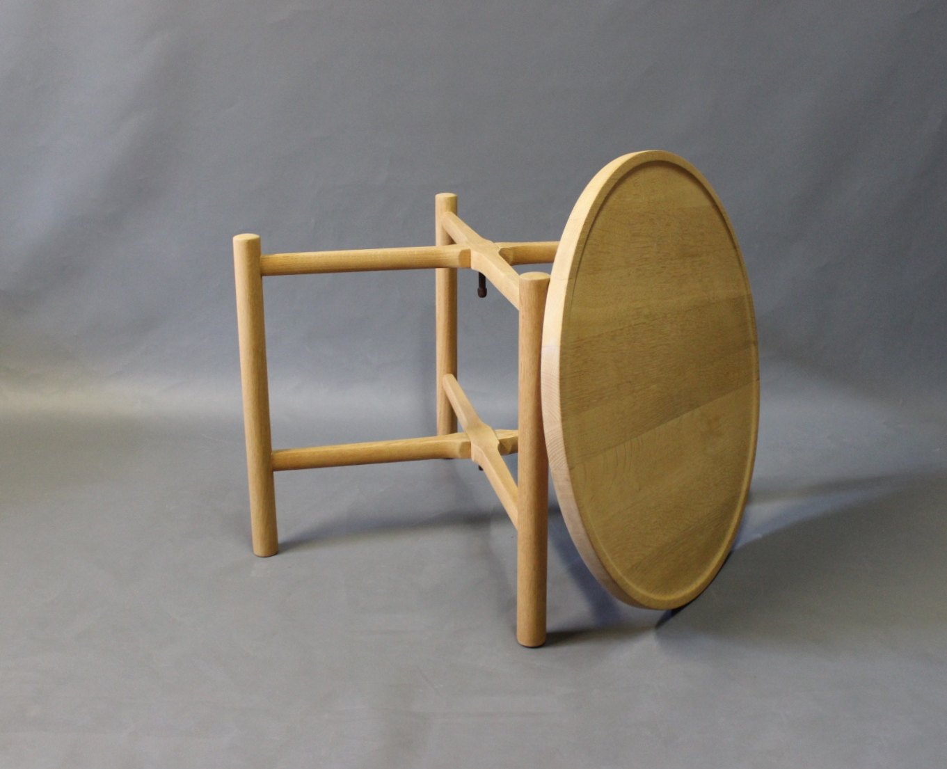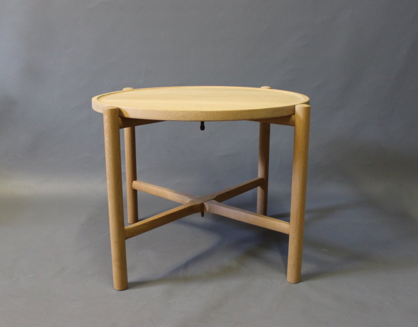 SolgtSidebord, model PP35, i sæbebehandlet eg designet af Hans J. Wegner i 1945 og fremstillet hos PP Møbler. Den runde træplade kan tages af og bruges som serveringsbakke, og bordet kan nemt foldes sammen og pakkes væk.