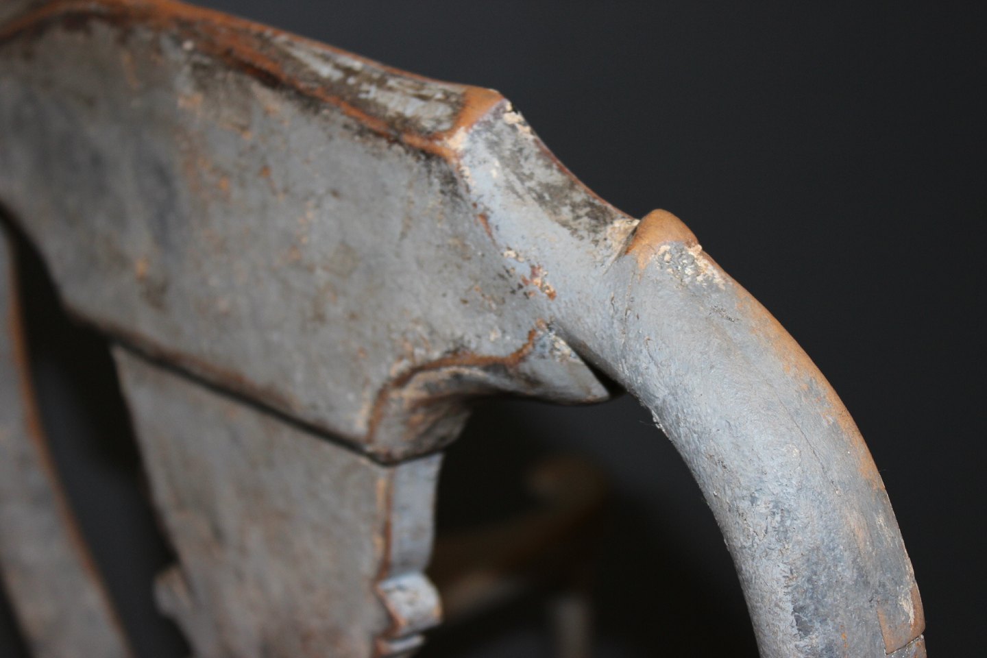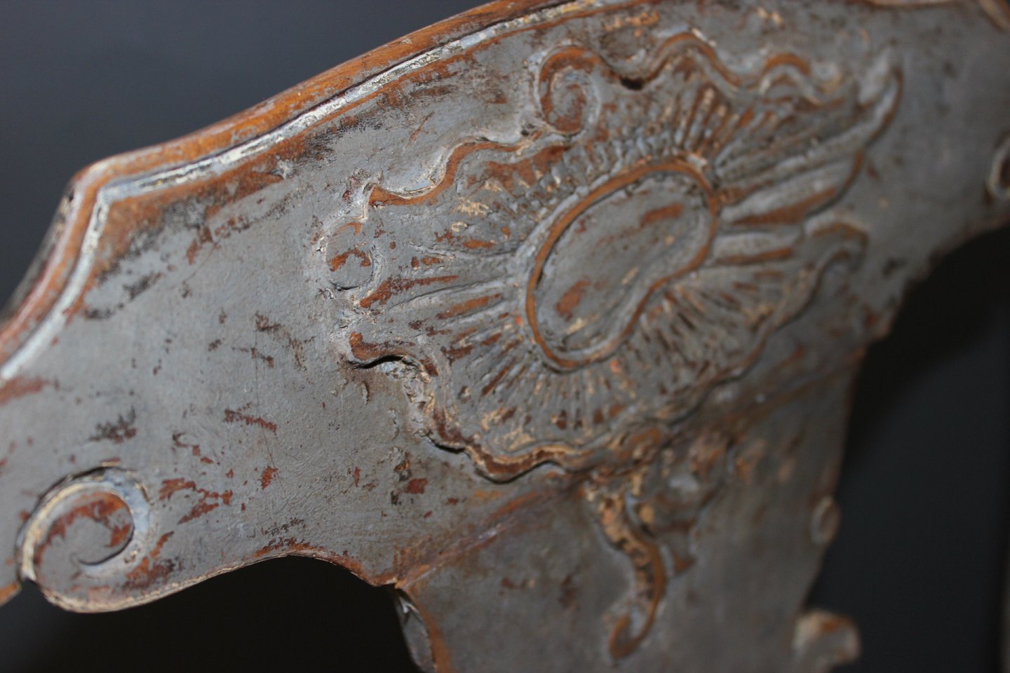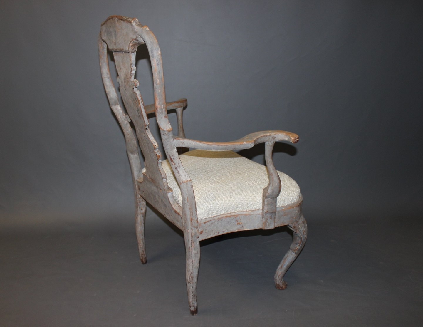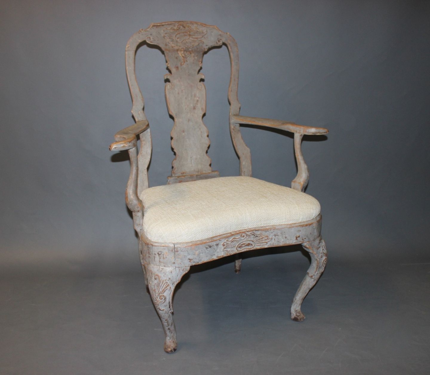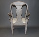 Armstol i Barok stil fra år 1760érne. Stolen er nypolstret og fremstår i rigtig flot stand. Og er gråmalet.