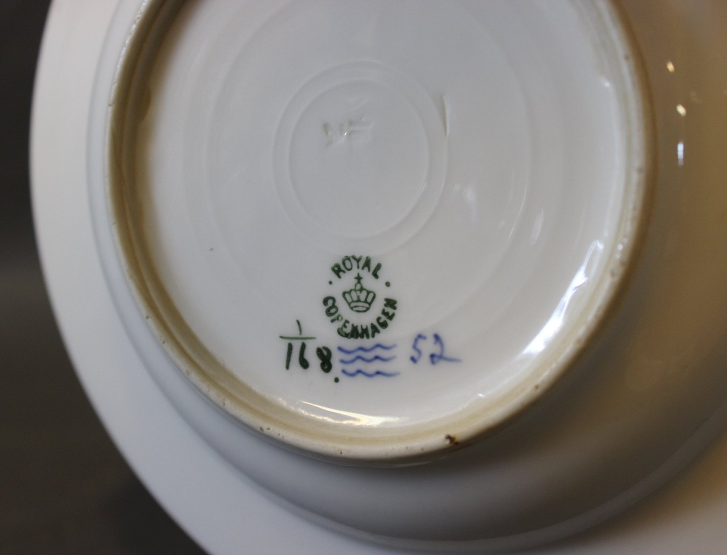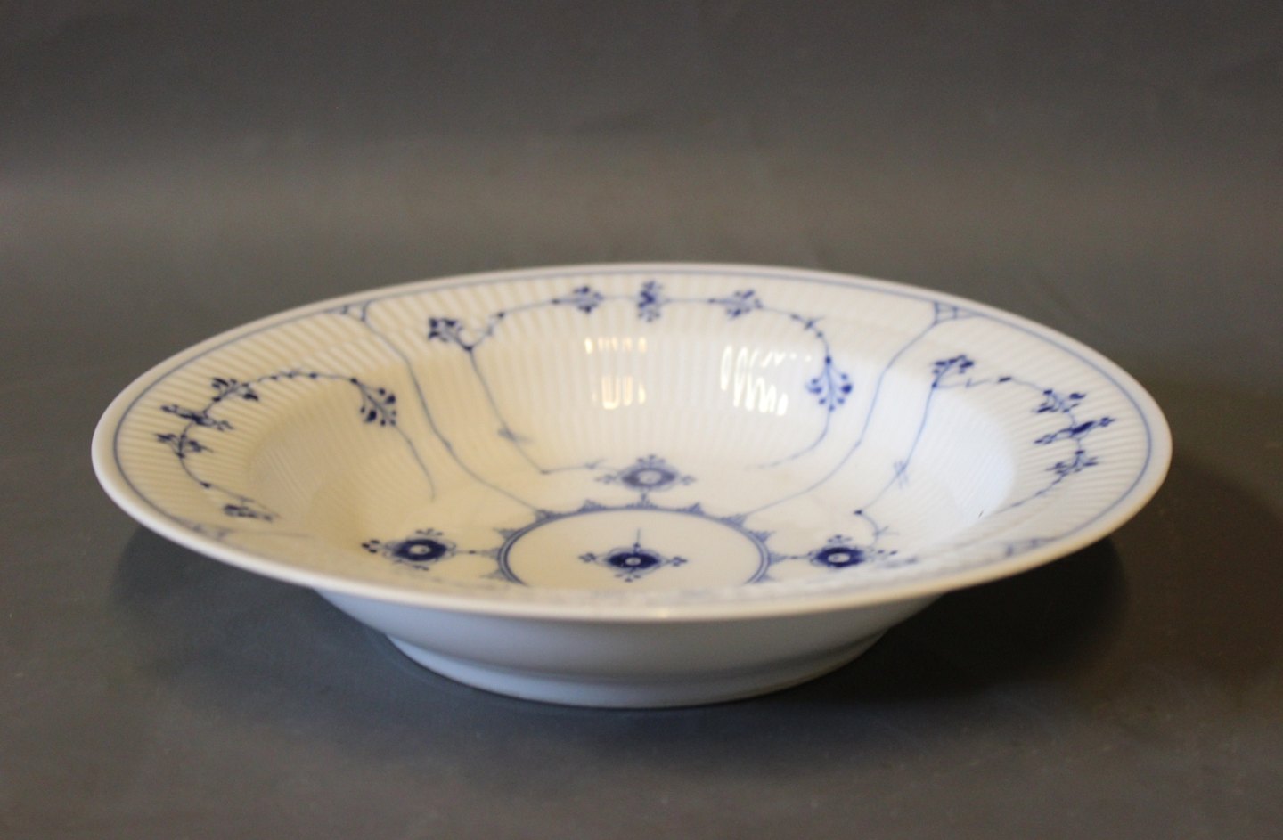 SolgtKgl. Musselmalet riflet dyb frokosttallerken, nr.: 1/168. Spørg for antal på lager.