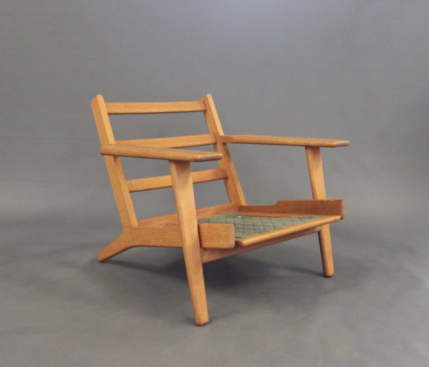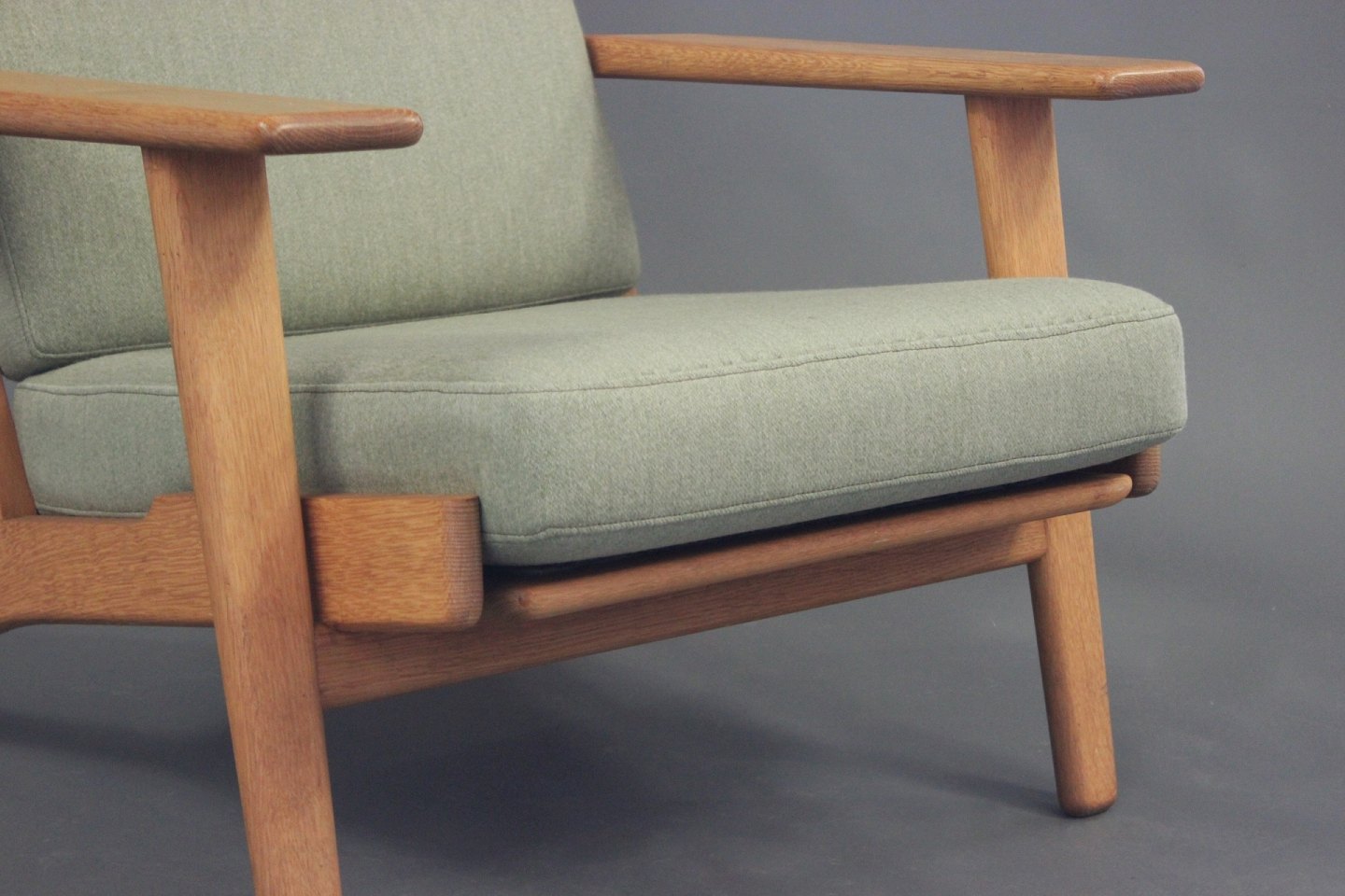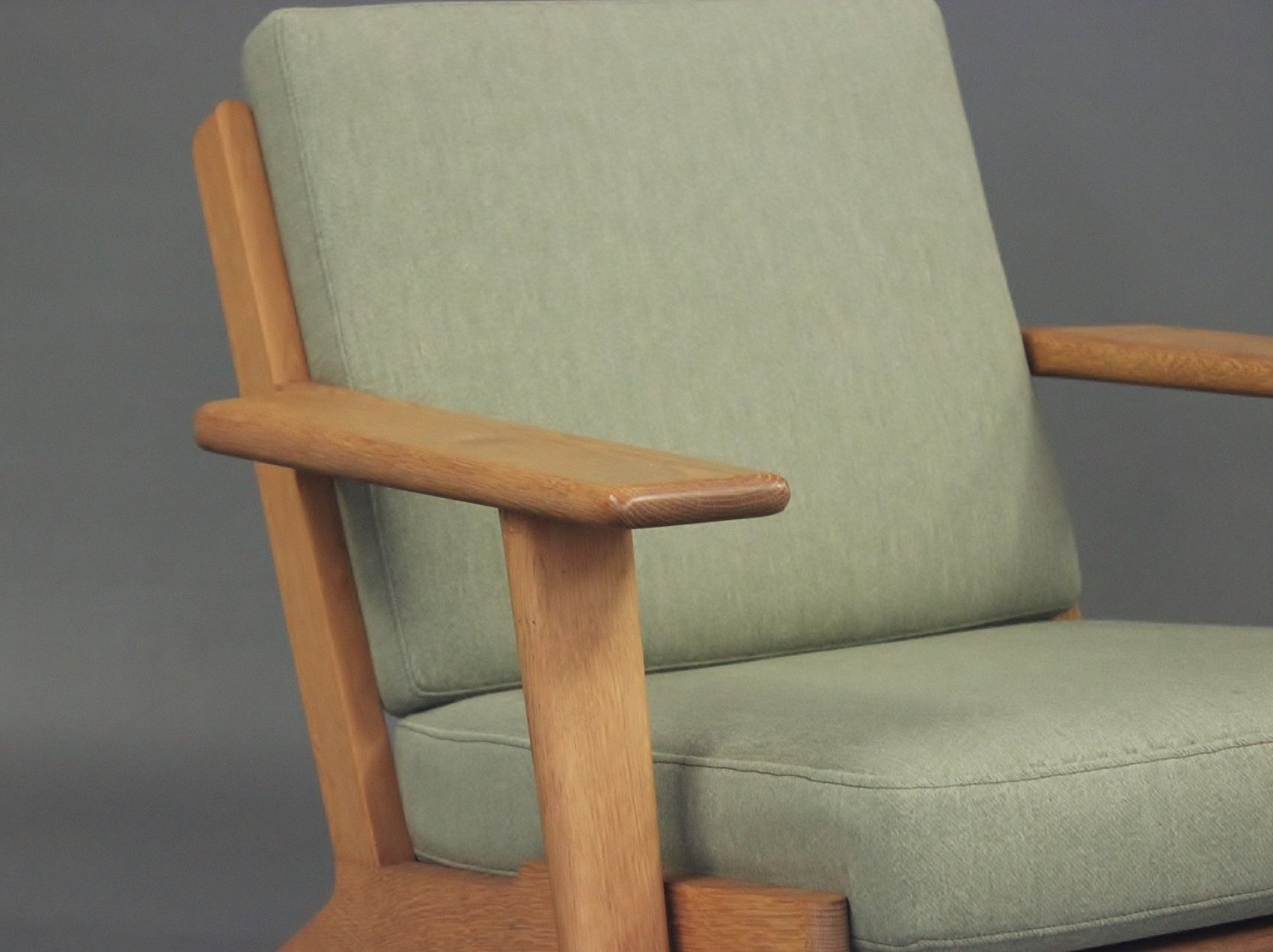 SolgtArmstol, model GE290, samt tilhørende skammel, designet af Hans J. Wegner i 1950erne og fremstillet hos GETAMA i 1960erne. Stolen og skamlen er af eg og hynder polstret med lysegrønt Hallingdal uld.