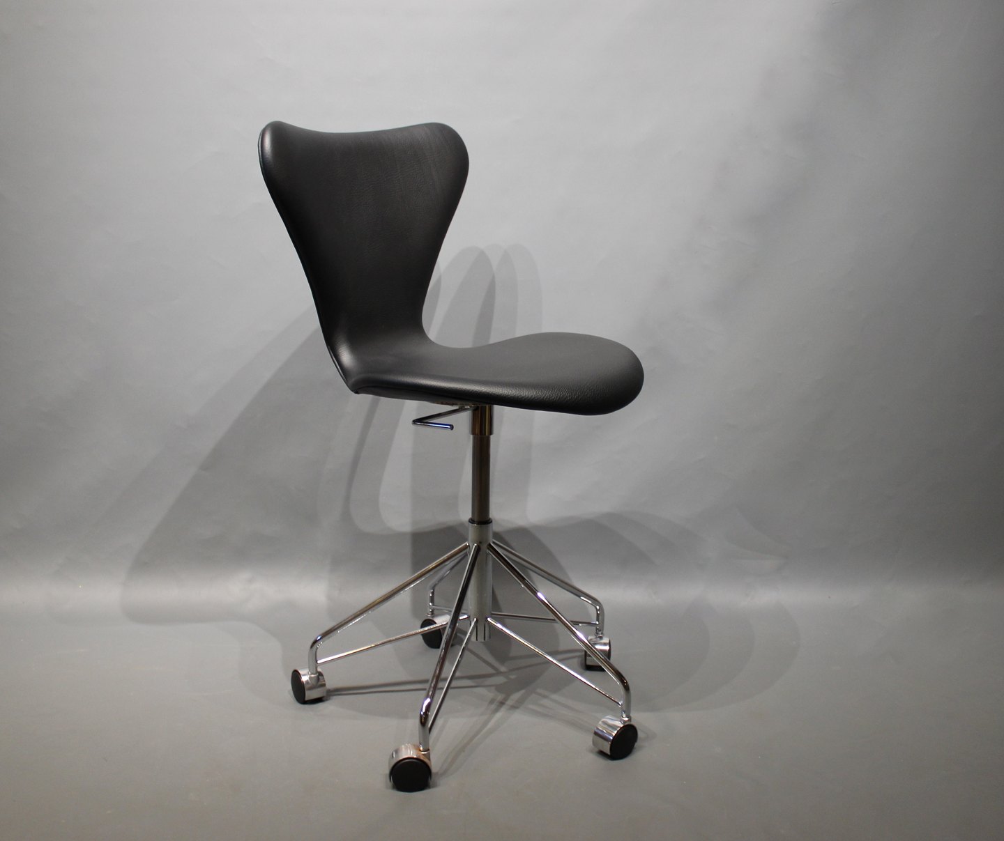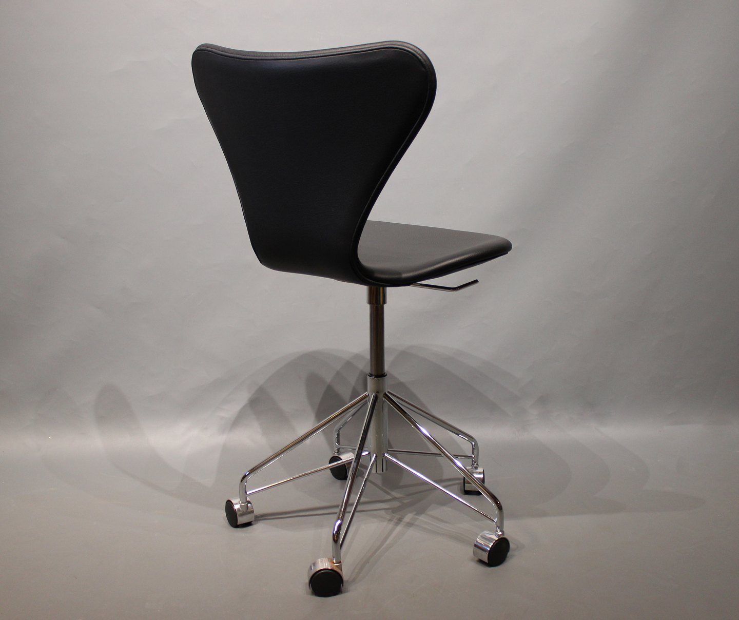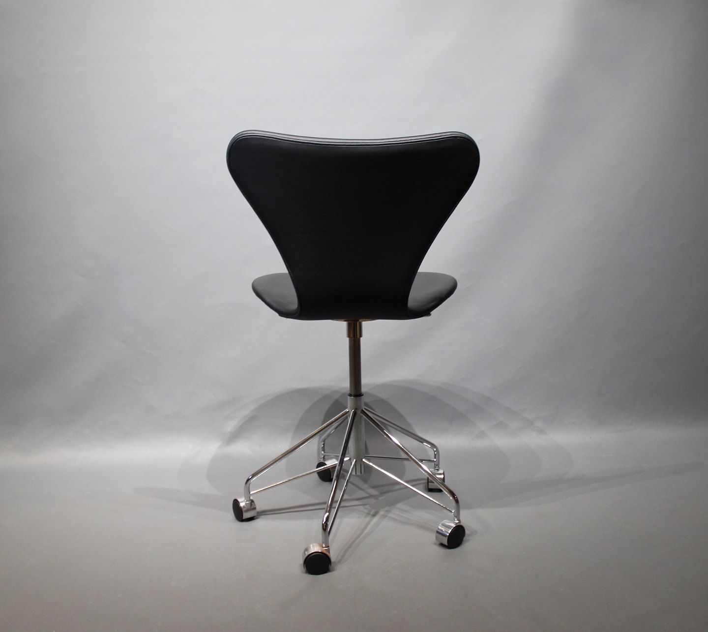 SoldSeven office chair, model 3117, in classic black leather designed by Arne Jacobsen and manufactured by Fritz Hansen in 2017.