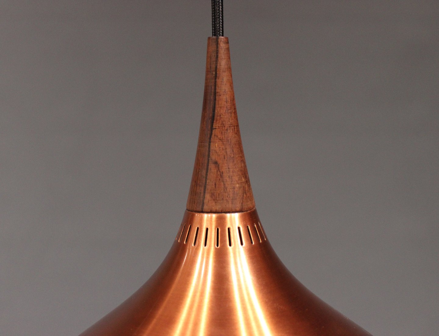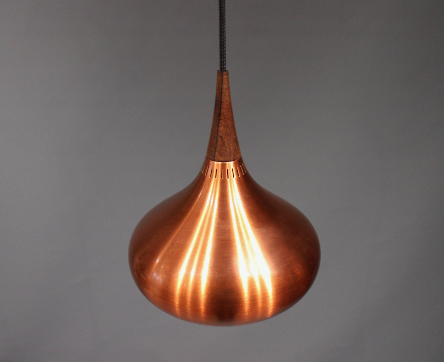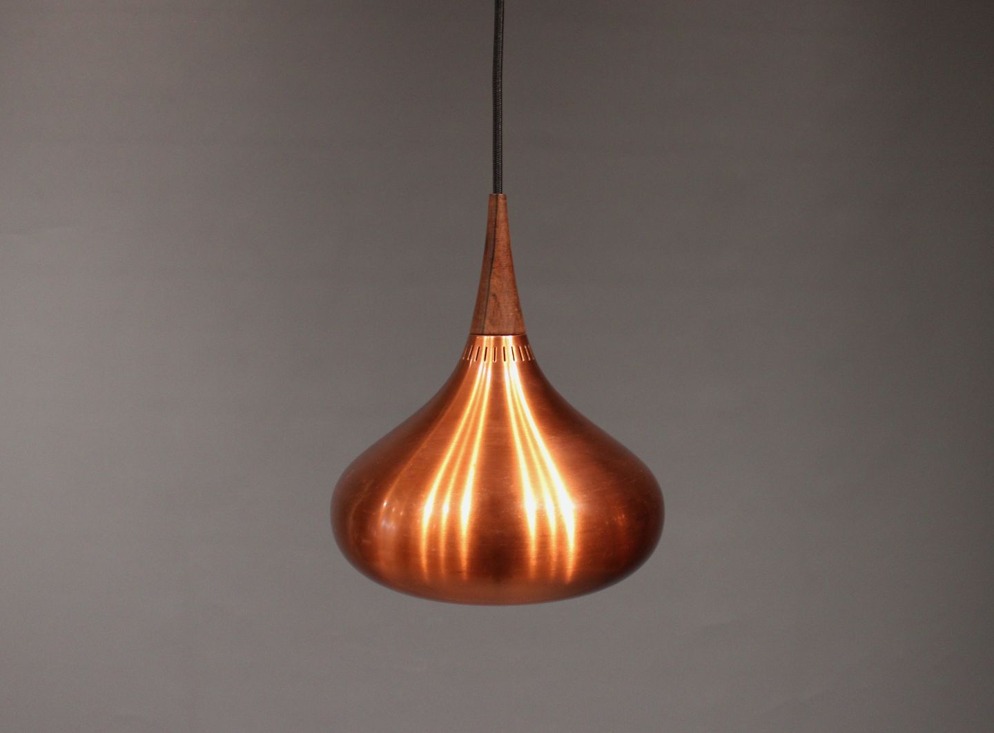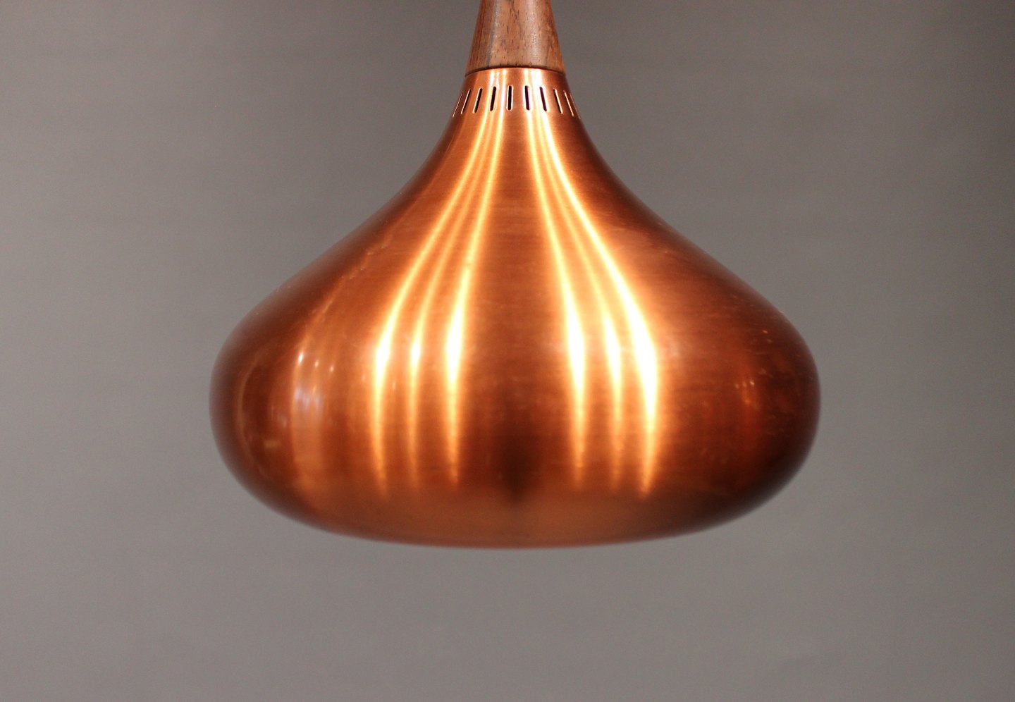 "Orient" pendel, model P1, designet af Jo Hammerborg for Fog og Mørup i Danmark i 1960erne. Lampen er af børstet kobber og palisander.