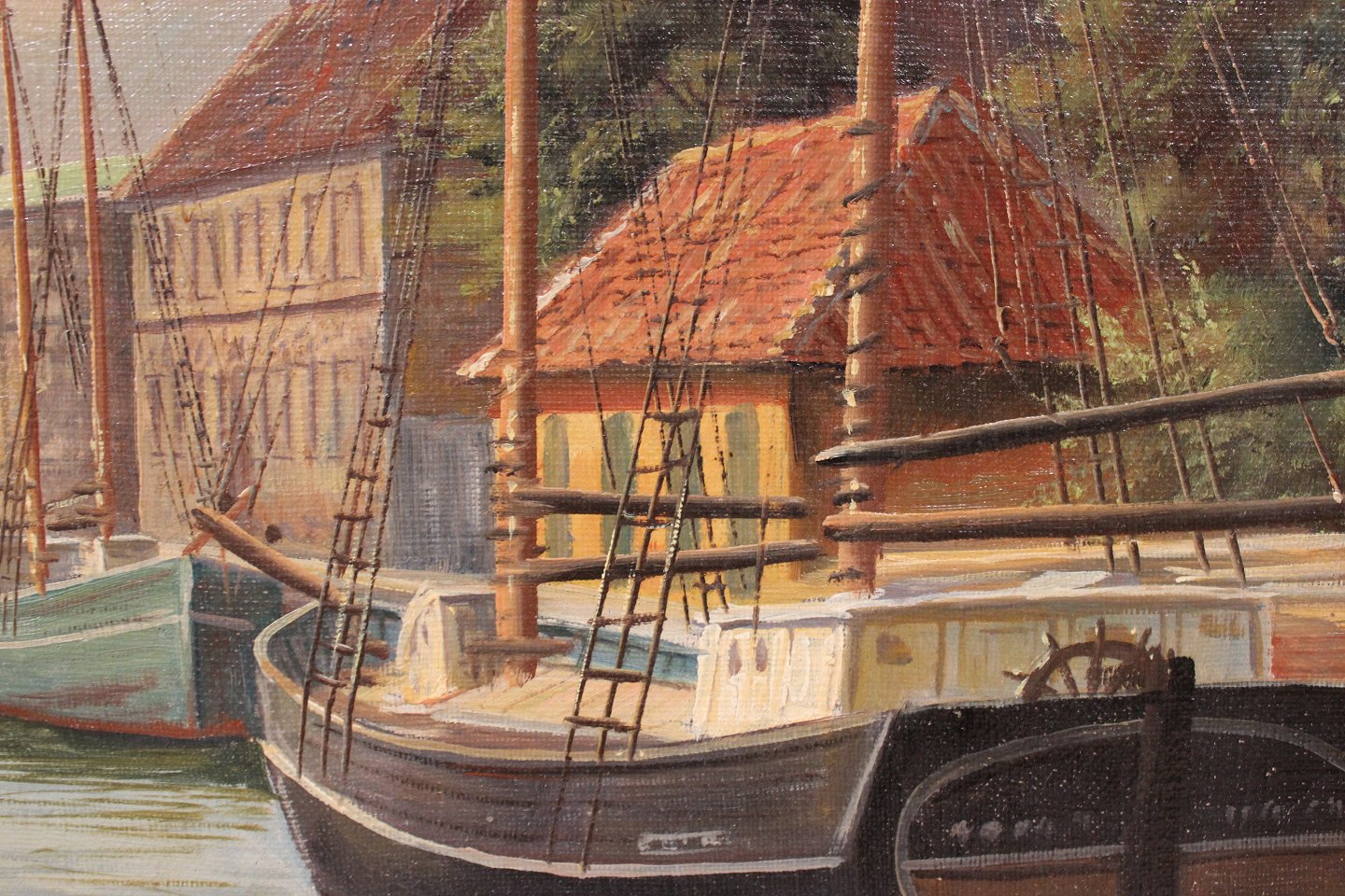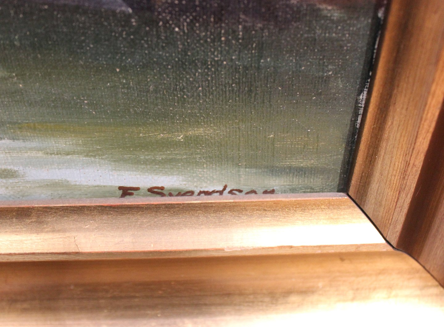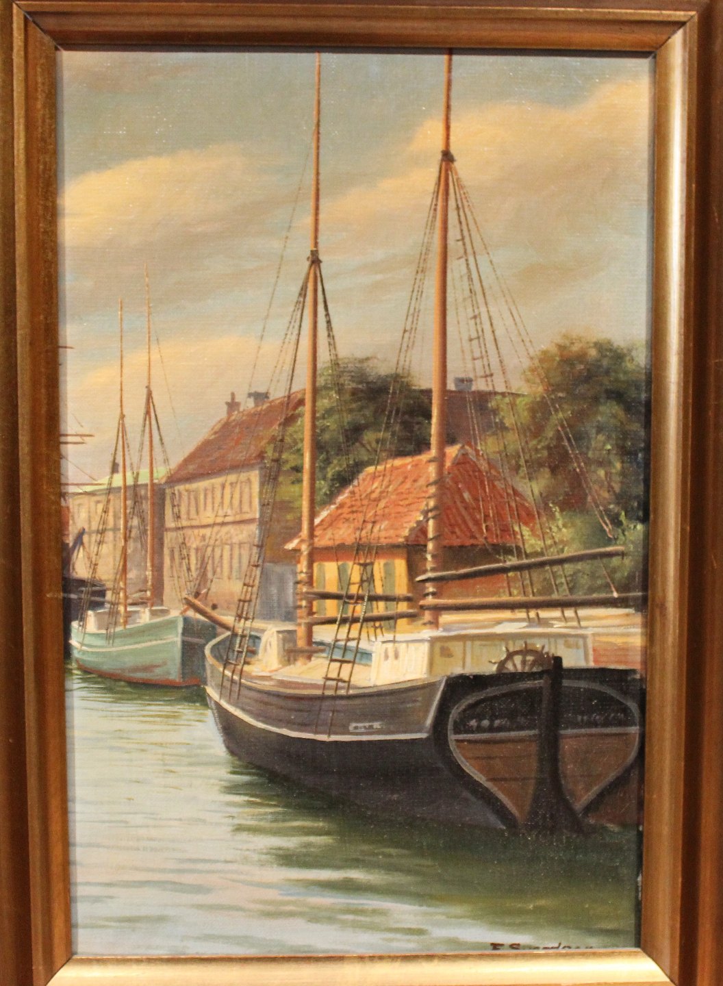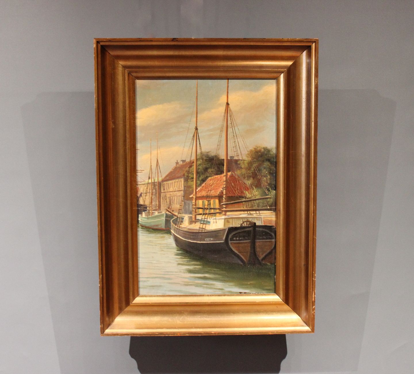 SoldPainting with boat motif and gilded wooden frame, signed F. Svendsen.